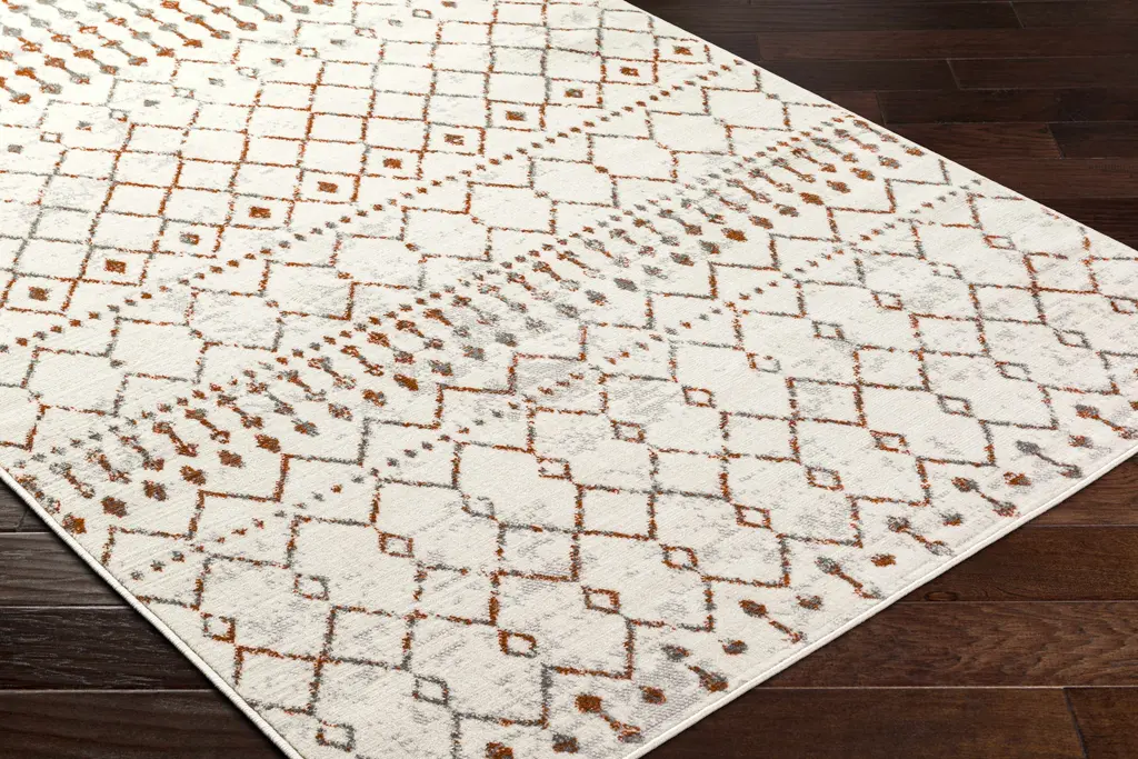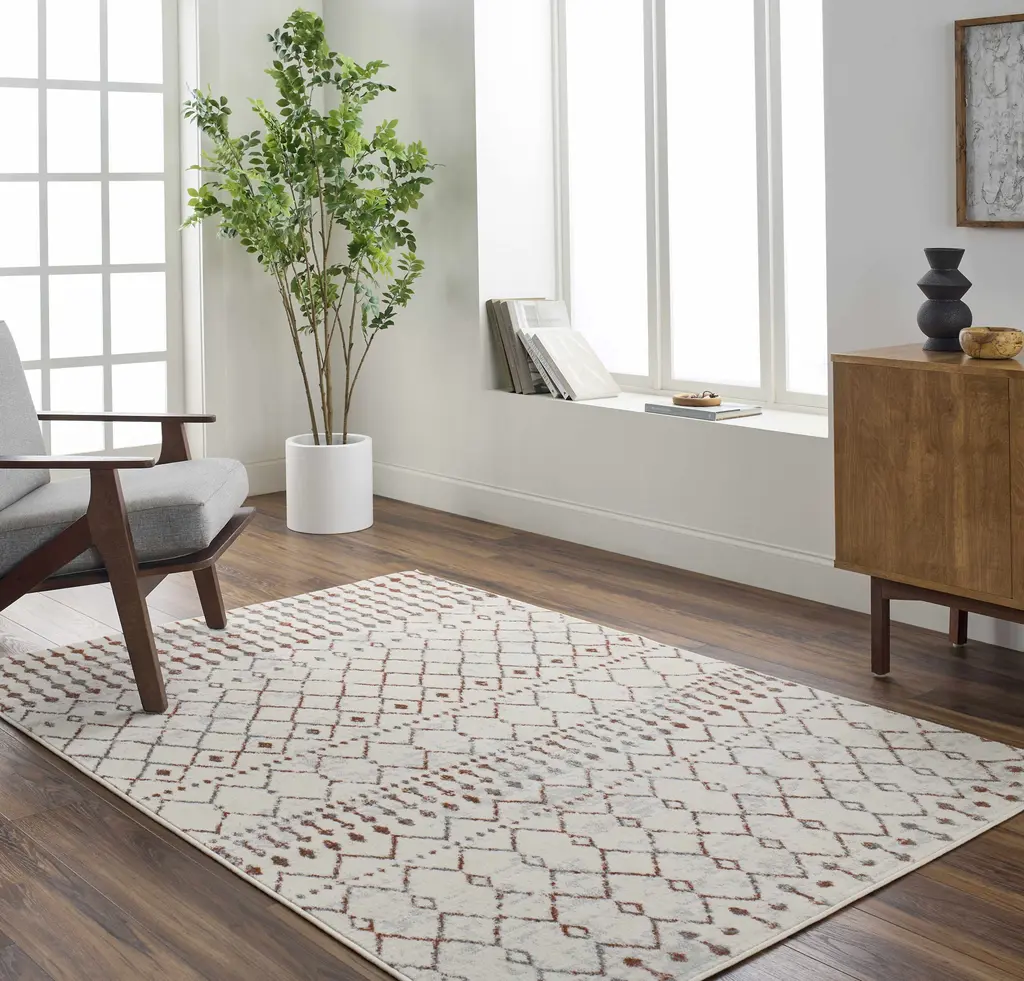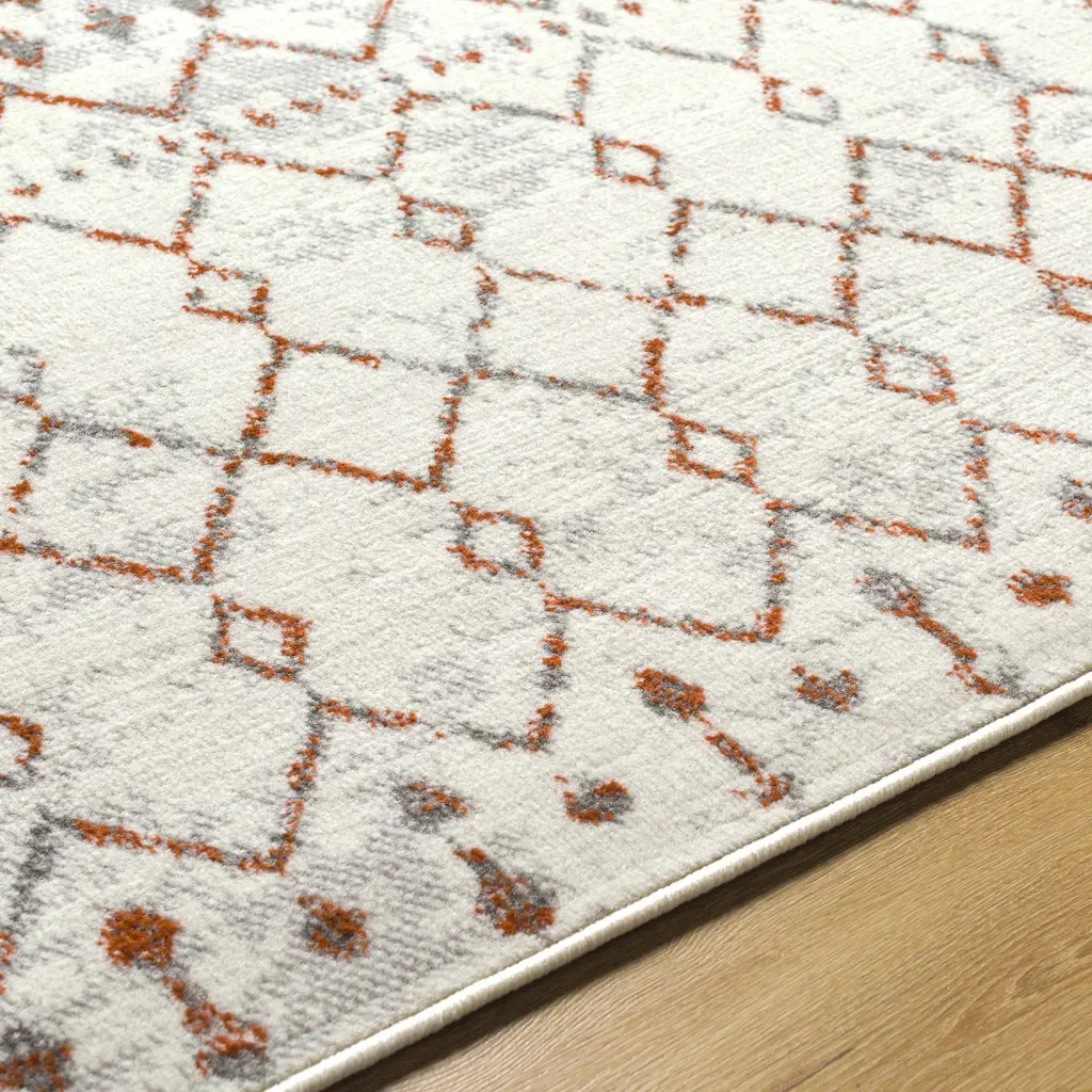 Collection: Medea Colors: Light Gray, Charcoal, Medium Gray, Burnt Orange Construction: Machine Woven Material: 100% Polypropylene Pile: Medium Pile Pile Height: 0.28" Styles: Transitional,Bohemian Made In: Turkey Thickness: 0.43" Price Range: $$$$$ (Most Affordable)