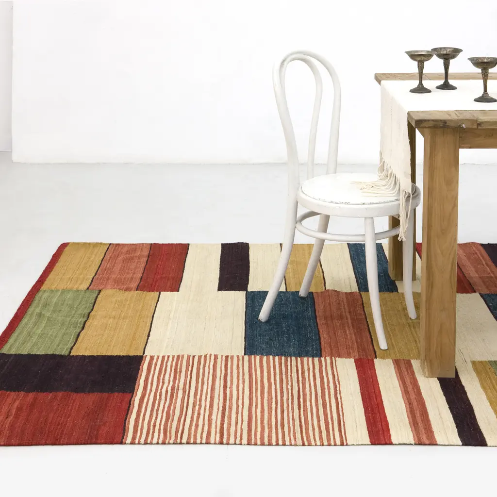 Inspired by rugs from long ago, this collection revisits the original essence, focusing on texture and usage through the kilim technique. Originally, rugs were used to protect people from direct contact with the ground. Entire communities and families gathered on their rugs, which acted as a home, inherent in daily life, providing comfort. Over time, the rug has become a decorative element and a vehicle for cultural messages. The Medina collection represents the modern transformation of tradition. The classical aesthetic is achieved with handcrafted production in the north of Pakistan, using a very old and traditional technique: the kilim.