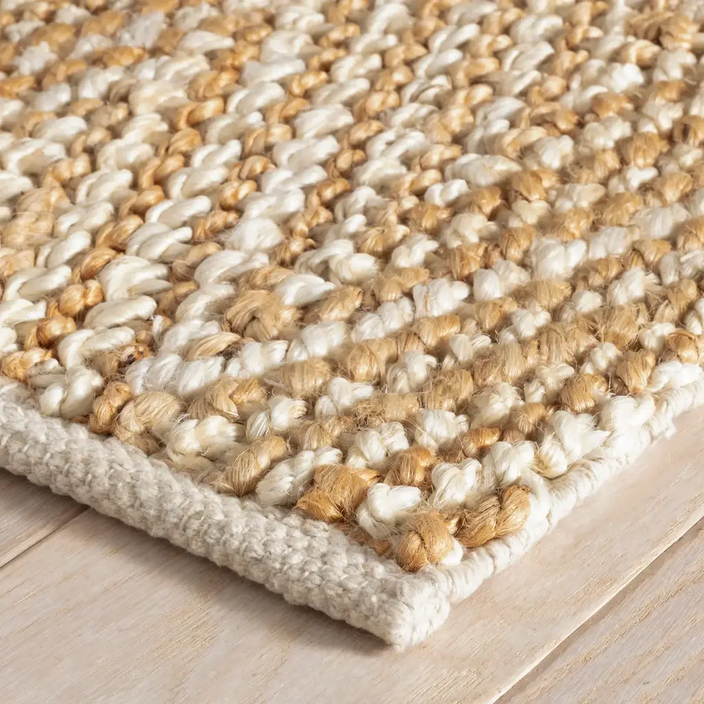 Chunky, ropey weave of thickly twisted undyed jute packs color and texture variations into an oversize tweedy herringbone. Traditional in Celtic wool tweeds, Roman highways, North American Indian basketry, Ancient Egyptian textiles, the chevron is a motif that unites us through the ages and is never out of style.