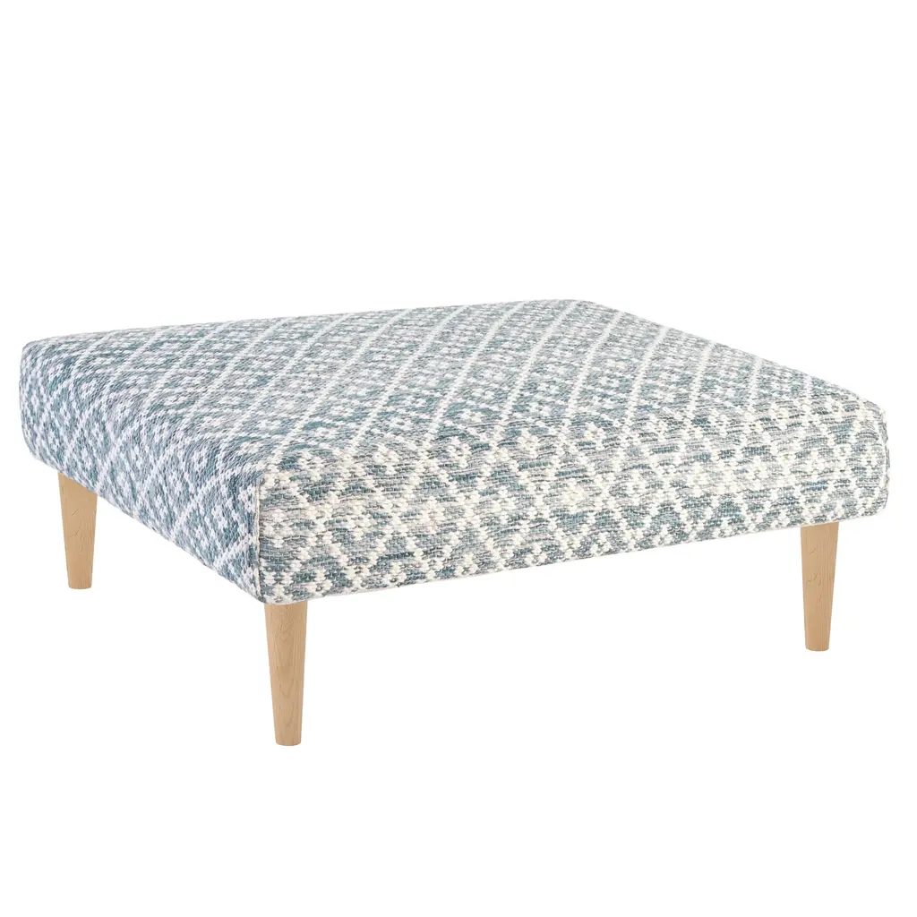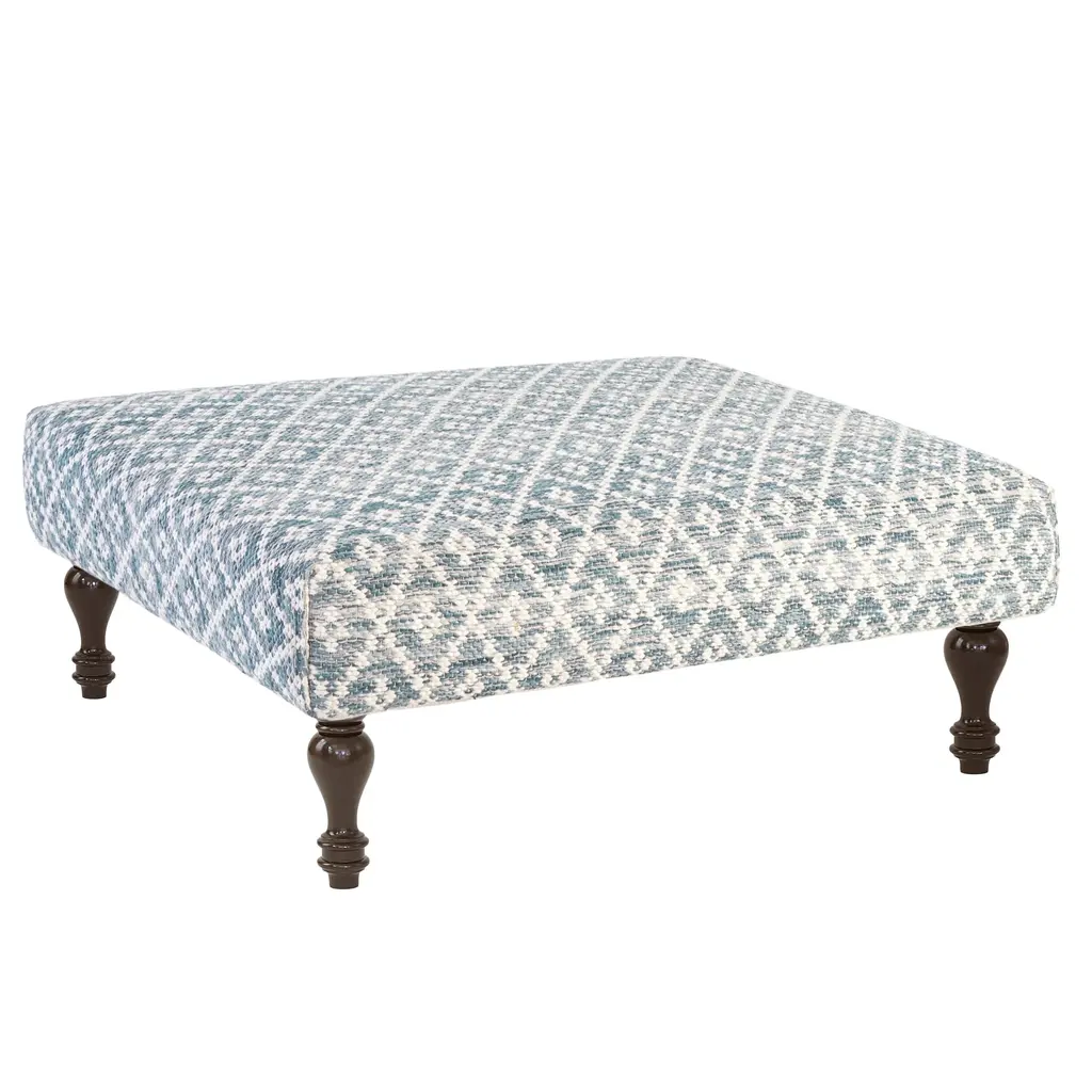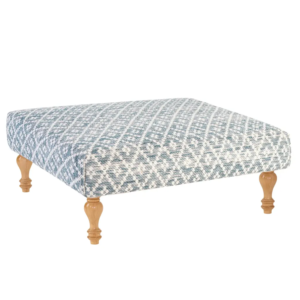 A customer favorite, our picture-perfect Melange Diamond Handwoven Cotton Rug is now reimagined and upholstered as a contemporary collectible ottoman. Its intricate, eye-catching motif - a classic diamond pattern made with a faded melange of monochromatic mineral blues - is ideal in any setting, from coastal to cottage, modern to traditional. This cushioned ottoman is held aloft by a choice of shapely turned-wood legs in a variety of finishes. An ideal placement for front of sofa or end of bed, doing double duty as occasional seating and staging area for a tray. This supersmart addition to entryway, living room or bedroom is a versatile investment piece, available in two sizes.