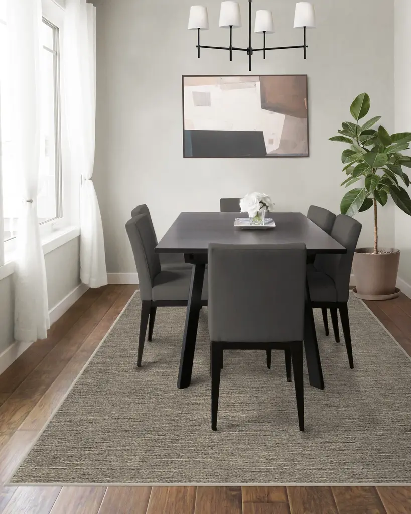 Calm and playful. Our Melange Solid Natural Stone Rug embraces warm dove grey hues that seamlessly mix together for a tranquil yet expressive design. Water-resistant, stain-resistant, and machine-washable.