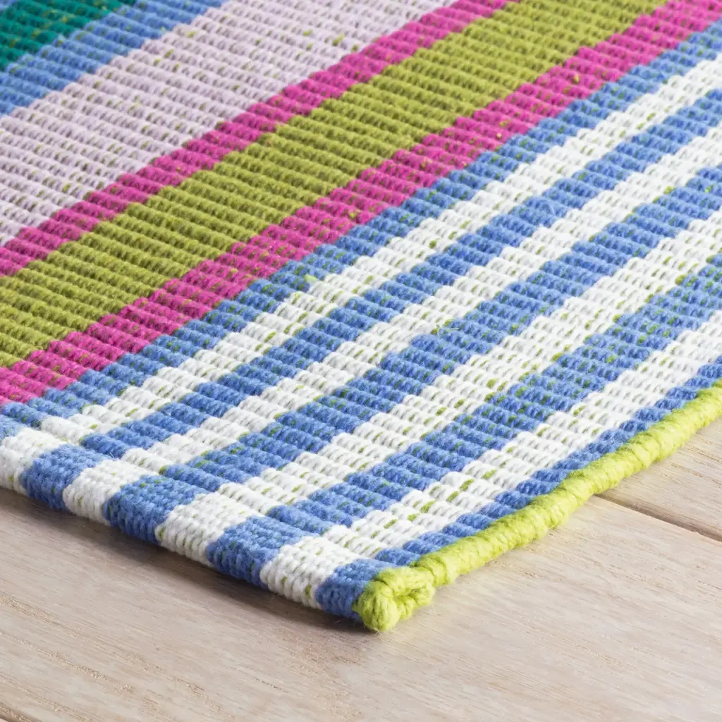 In varying shades of citrus, blue, orange, pink, and green, this striped woven cotton rug is a lighthearted, bright addition to any room.
