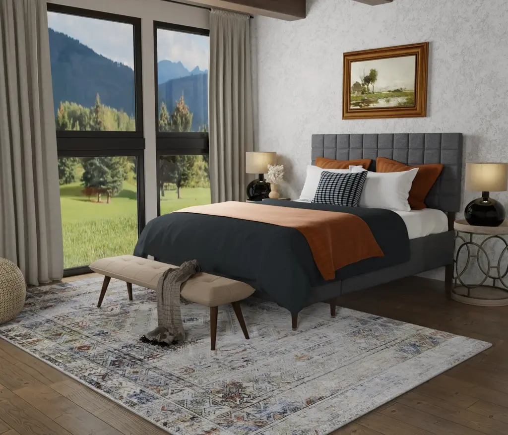Collection: Melrose Colors: Gray, Red, Blue Construction: Machine Made Material: Face: Polypropylene, Polyester, Viscose / Warp: Cotton Pile: Low Pile Pile Height: 0.47" Styles: Transitional,Casual,Industrial Backing: Cotton Made In: Turkey Thickness: 0.47" Price Range: $$$$$ (Affordable)