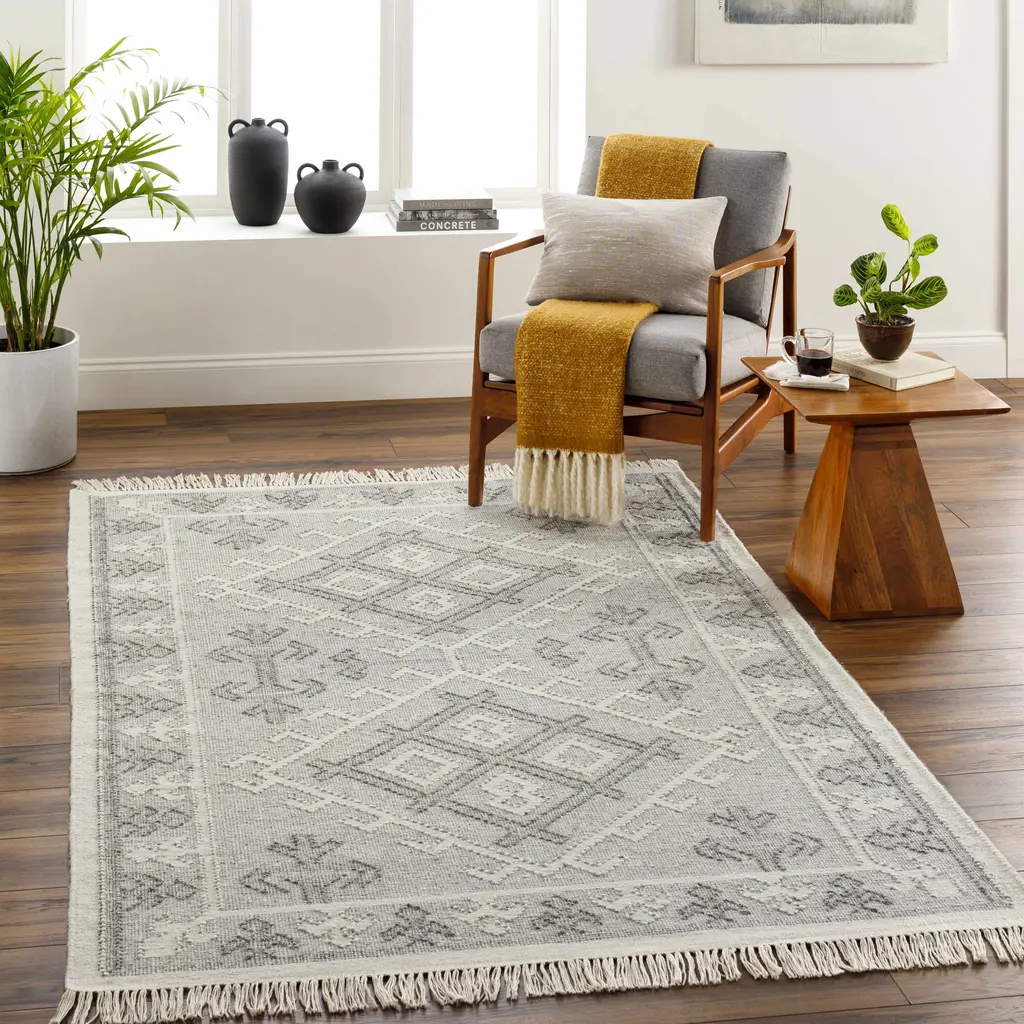 Collection: Memo Colors: Light Gray, Gray, Medium Gray, Dark Brown Construction: Hand Woven Material: 100% Wool Pile: No Pile Styles: Traditional Made In: India Thickness: 0.16" Fringe Length: 2.5" Price Range: $$$$$ (Affordable)