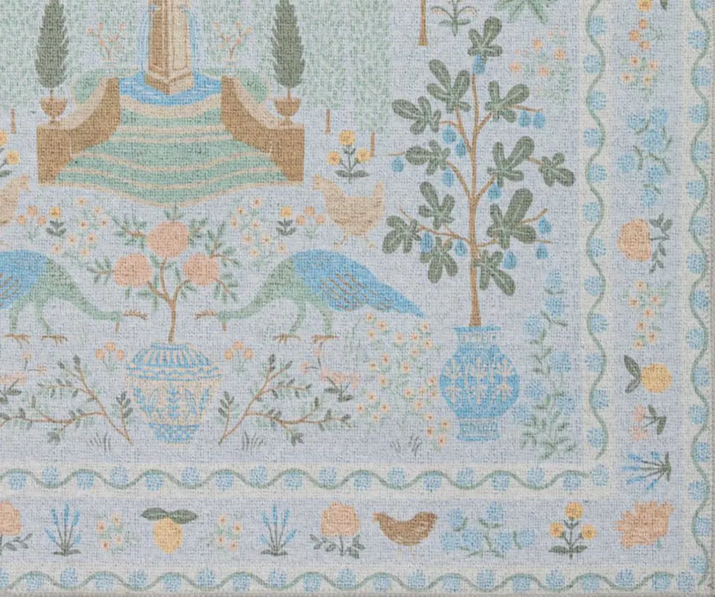 Inspired by an 18th-century farmhouse in Gascony, France, Camont features illustrated fig trees, lemon trees, chickens, and flowers of its pastoral grounds. This printed rug is powerloomed of 100% polyester pile in Turkey and designed to withstand foot traffic. Part of our Rifle Paper Co. × Loloi collection. The layout and scale of our rugs is adjusted to accommodate each available size, and may be different than what is pictured here. Images of each size are available by hovering over the desired size on our desktop site.