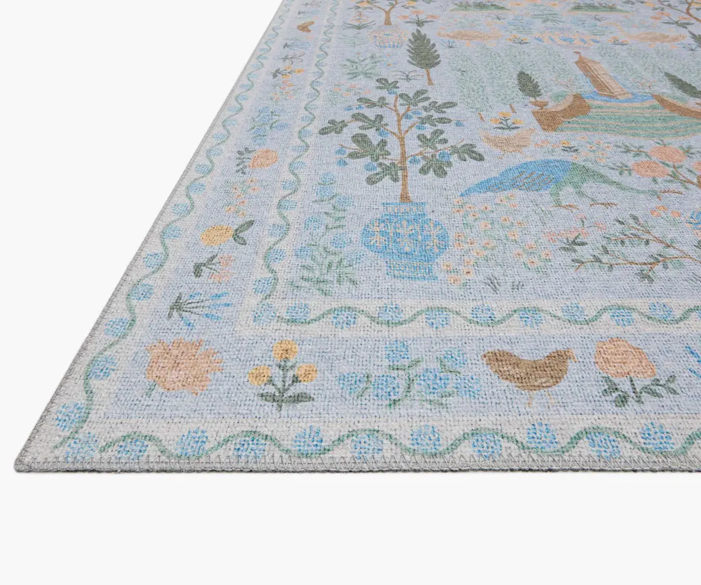 Inspired by an 18th-century farmhouse in Gascony, France, Camont features illustrated fig trees, lemon trees, chickens, and flowers of its pastoral grounds. This printed rug is powerloomed of 100% polyester pile in Turkey and designed to withstand foot traffic. Part of our Rifle Paper Co. × Loloi collection. The layout and scale of our rugs is adjusted to accommodate each available size, and may be different than what is pictured here. Images of each size are available by hovering over the desired size on our desktop site.