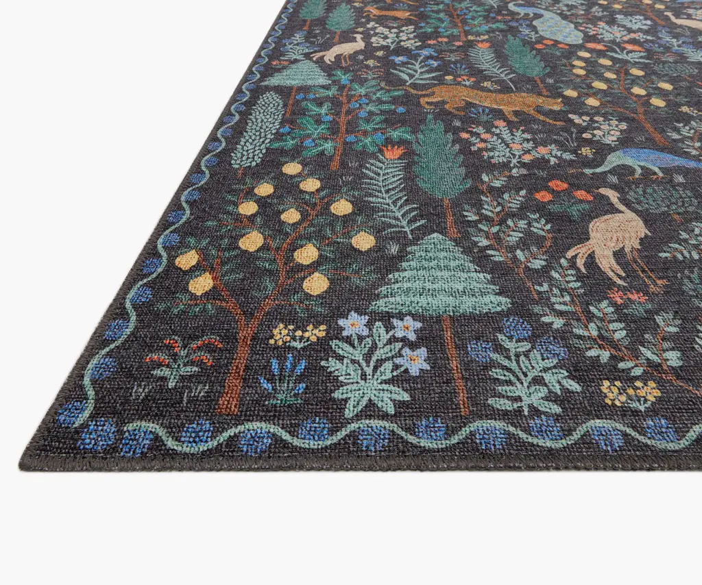 llustrated animals roam through a grove of flowers and trees on our Menagerie Forest rug, inspired by modern artists of the early 20th century. This printed rug is powerloomed of 100% polyester pile in Turkey and designed to withstand foot traffic. Part of our Rifle Paper Co. × Loloi collection. The layout and scale of our rugs is adjusted to accommodate each available size, and may be different than what is pictured here. Images of each size are available by hovering over the desired size on our desktop site.