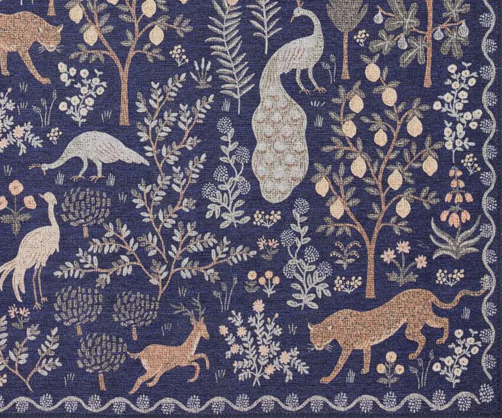 llustrated animals roam through a grove of flowers and trees on our Menagerie Forest rug, inspired by modern artists of the early 20th century. This printed rug is powerloomed of 100% polyester pile in Turkey and designed to withstand foot traffic. Part of our Rifle Paper Co. × Loloi collection. The layout and scale of our rugs is adjusted to accommodate each available size, and may be different than what is pictured here. Images of each size are available by hovering over the desired size on our desktop site.