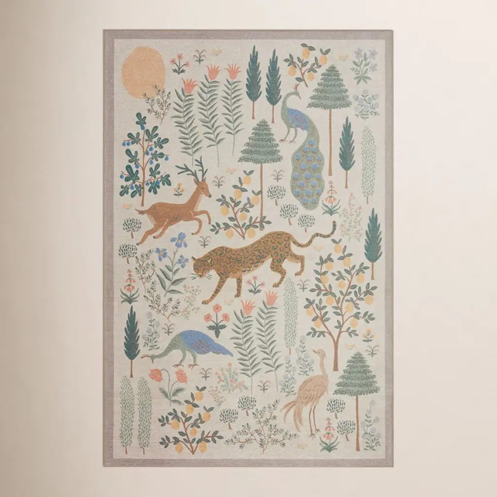 Inspired by modern artists of the early 20th century, our Les Fauves rug features an oversized forest of illustrated creatures and stylized trees and flowers, under a glowing sun. This printed rug is powerloomed of 100% polyester pile in Turkey and designed to withstand foot traffic. Part of our Rifle Paper Co. × Loloi collection. The layout and scale of our rugs is adjusted to accommodate each available size, and may be different than what is pictured here. Images of each size are available by hovering over the desired size on our desktop site.
