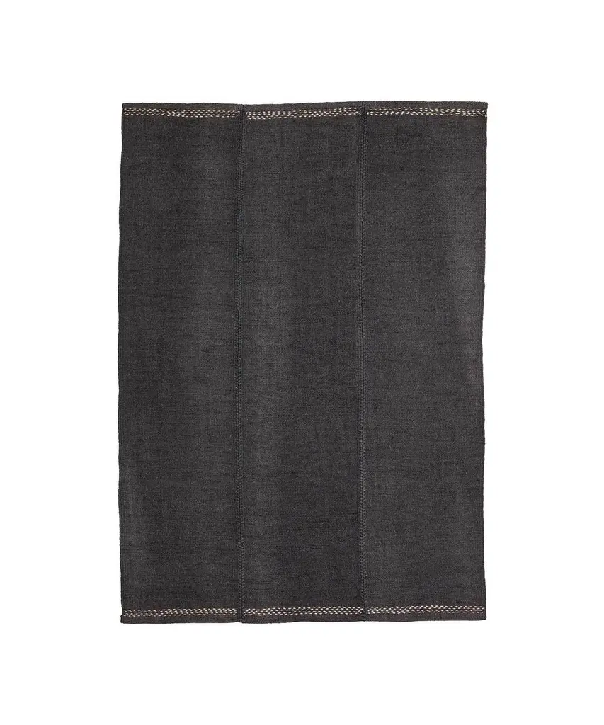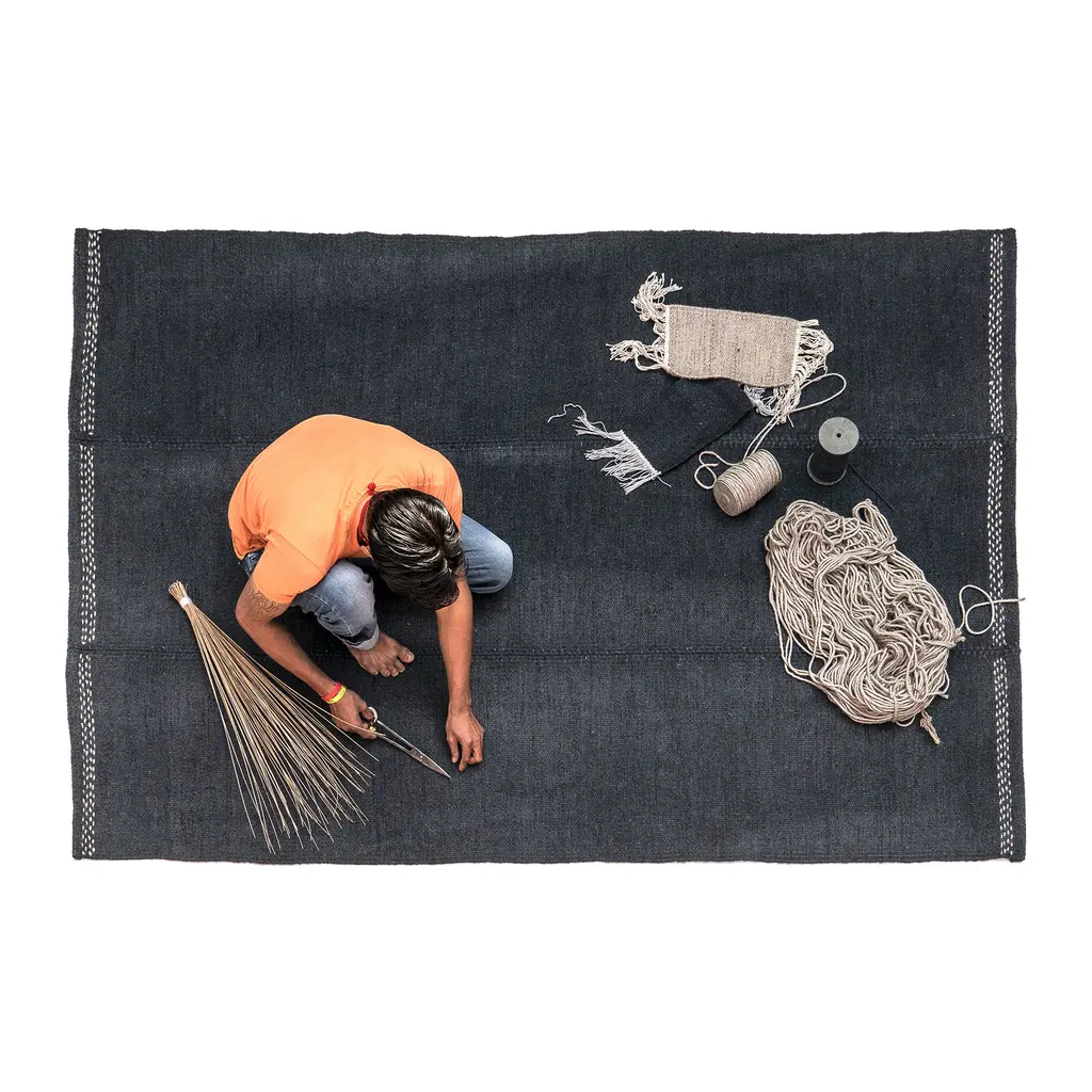 An artisanal flat-weave made in India, the Mía rug is a Dhurrie created by joining three pieces, individually dyed, to obtain a worn, lived-in effect.Create your own rug: choosing between two sizes, four colors, and four different finishes. You can contrast seams, add different types of fringes or opt for colorful stitches. Infinite results are possible; each detail makes a difference, ensuring your rug is unique.