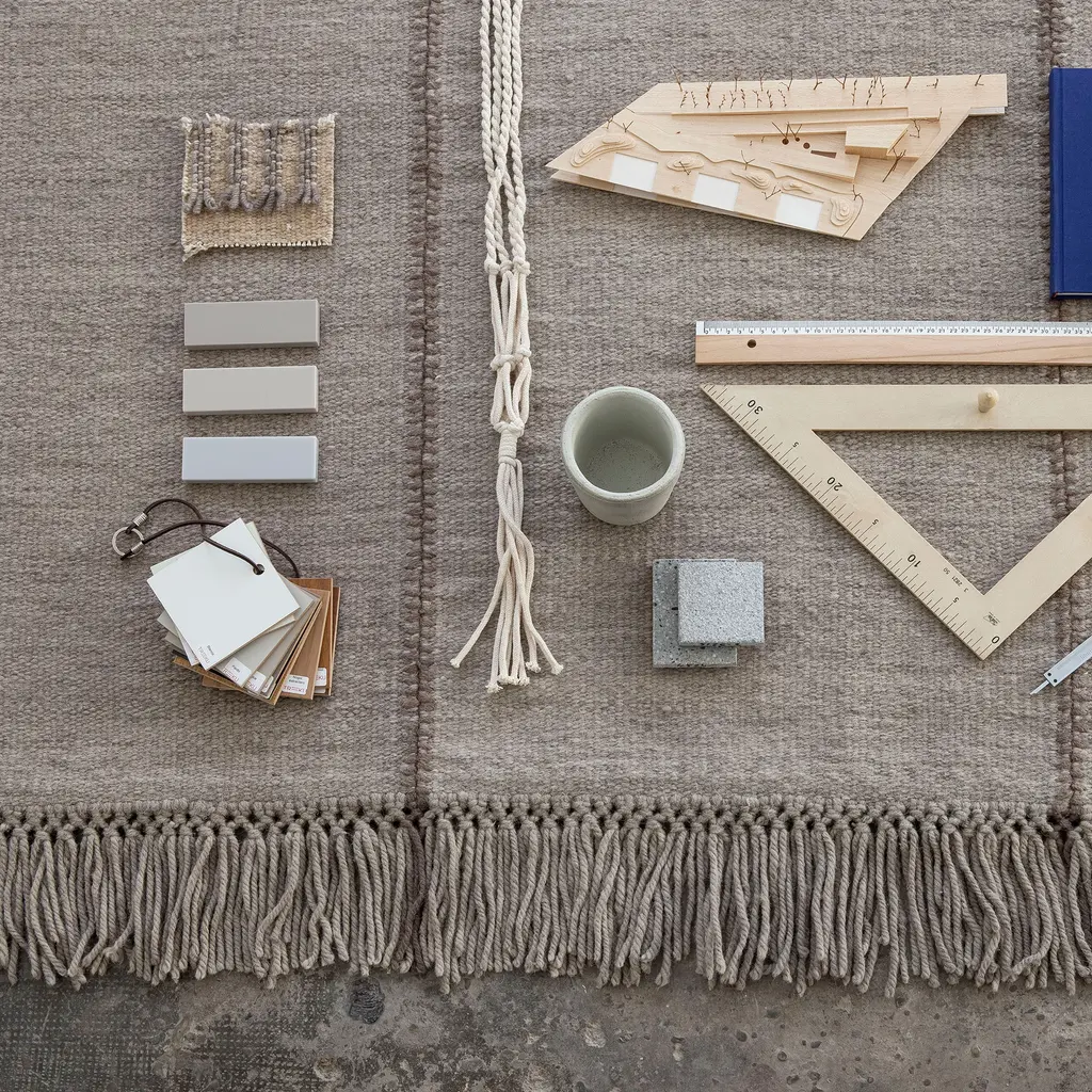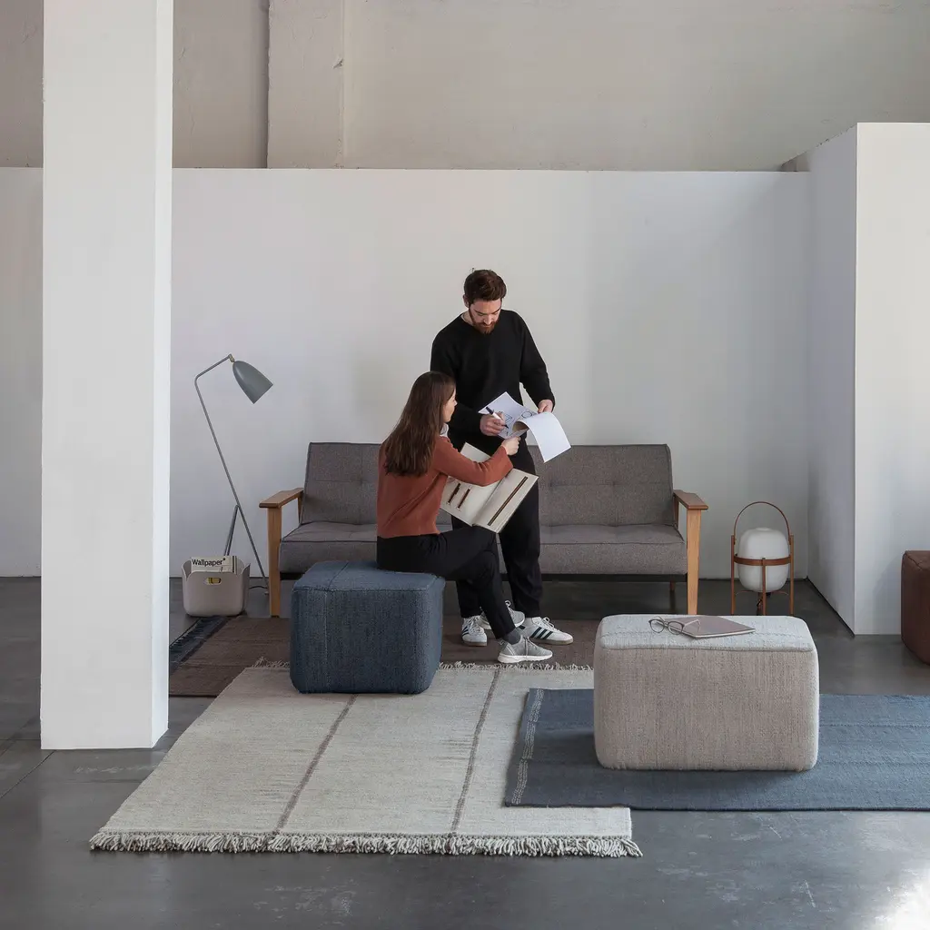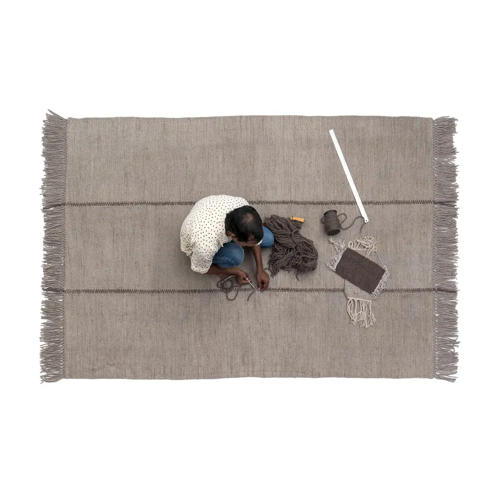 An artisanal flat-weave made in India, the Mía rug is a Dhurrie created by joining three pieces, individually dyed, to obtain a worn, lived-in effect. Create your own rug: choosing between two sizes, four colors, and four different finishes. You can contrast seams, add different types of fringes or opt for colorful stitches. Infinite results are possible; each detail makes a difference, ensuring your rug is unique.
