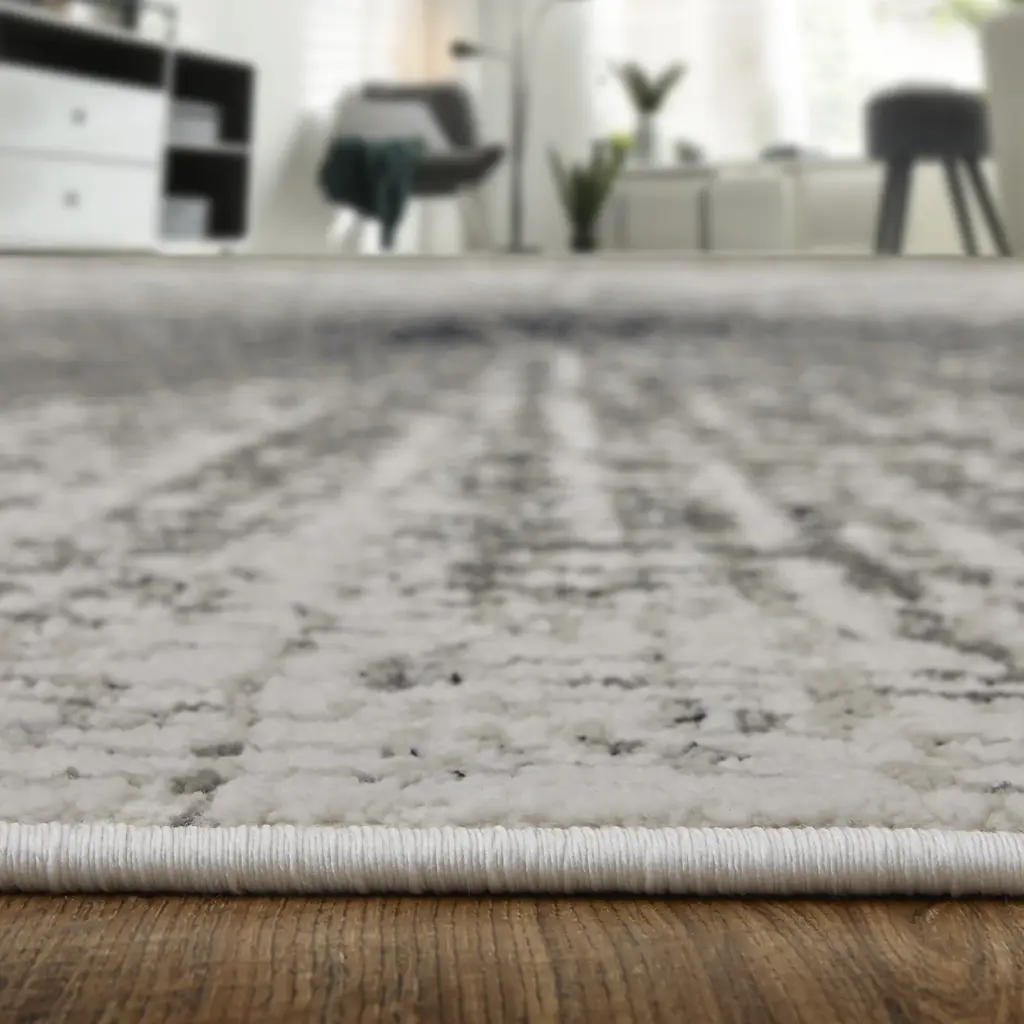 Collection: Micah Colors: Ivory, Gray, Blue Construction: Machine Made Material: Face: Polyester, Polypropylene / Warp: Jute Pile: Low Pile Pile Height: 0.39" Styles: Contemporary,Mid-Century Modern,Casual Backing: Jute Made In: Turkey Thickness: 0.39" Price Range: $$$$$ (Affordable)