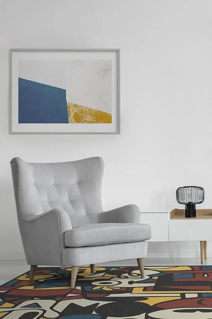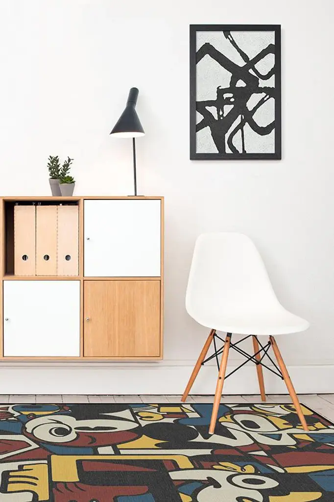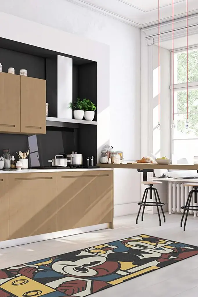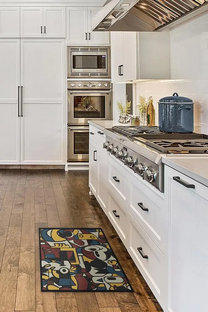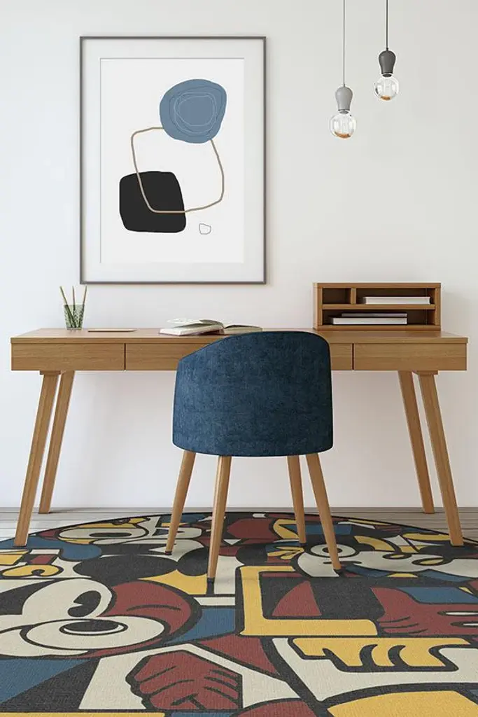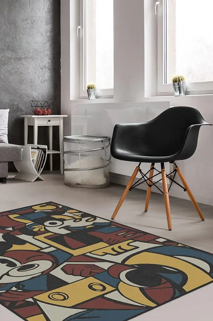 Mickey & Friends Multicolor Rug captures both the magic of Disney and the abstract modernism of Bauhaus design. Tinted in vintage colors of steel blue, ombre yellow and gala red, this rug features abstracted illustrations of Disney's cult-favorite characters: Mickey Mouse, Goofy, and Donald Duck. Fun and artsy, it's the perfect accent rug for any kid's room, playroom, or nursery.