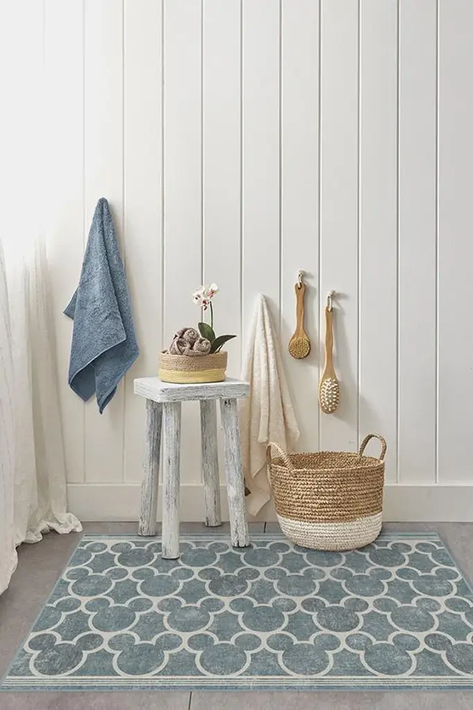 Mickey Trellis Slate Rug is inspired by the classic trellis rug motif. This allover design features graphic outlines of Mickey Mouse's head, tinted in pearl against a lightly distressed backdrop of slate blue and grey green. A truly elegant rug for any Disney fan.