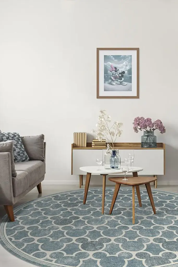 Mickey Trellis Slate Rug is inspired by the classic trellis rug motif. This allover design features graphic outlines of Mickey Mouse's head, tinted in pearl against a lightly distressed backdrop of slate blue and grey green. A truly elegant rug for any Disney fan.
