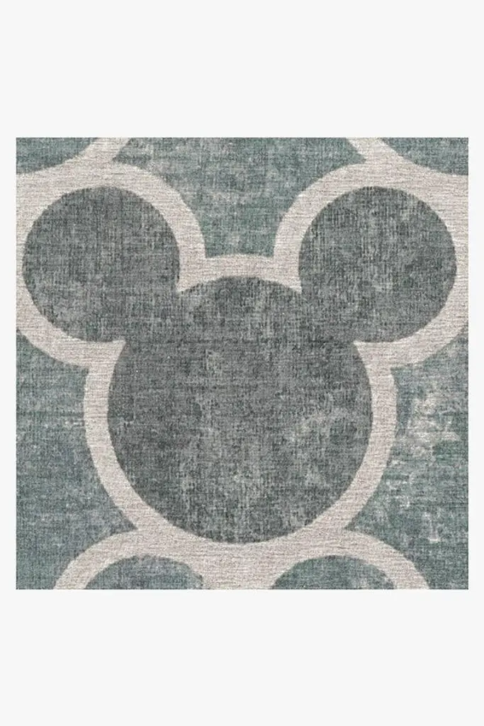 Mickey Trellis Slate Rug is inspired by the classic trellis rug motif. This allover design features graphic outlines of Mickey Mouse's head, tinted in pearl against a lightly distressed backdrop of slate blue and grey green. A truly elegant rug for any Disney fan.