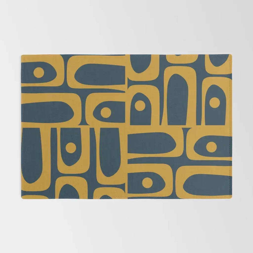 Mid Century Modern Abstract Piquet Multi Pattern In Dark Mustard And Navy Blue Rug