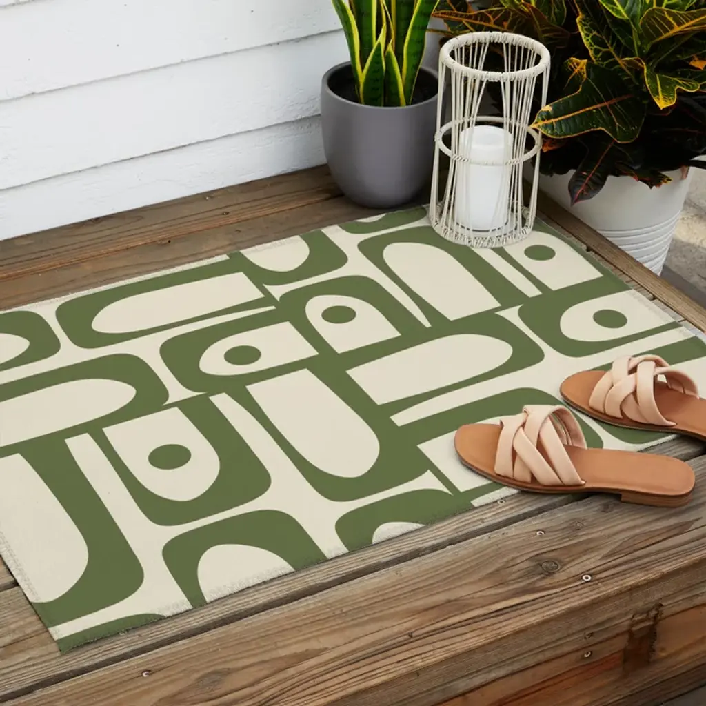 Mid Century Modern Abstract Piquet Pattern In Olive Green And Cream Outdoor Rug