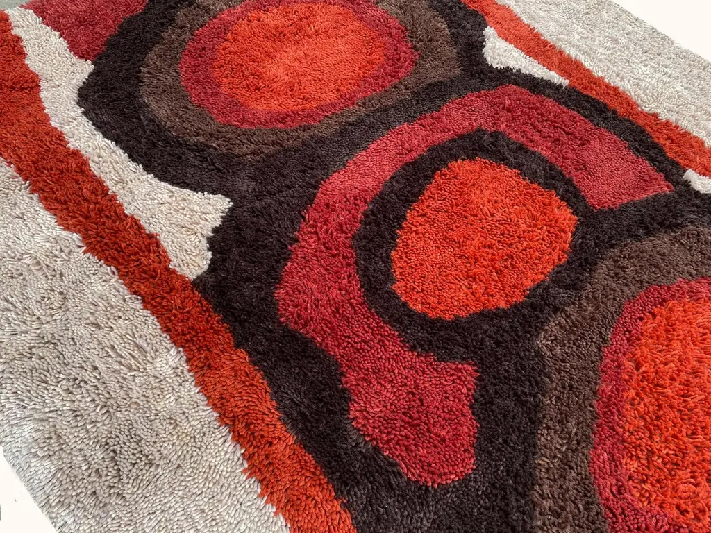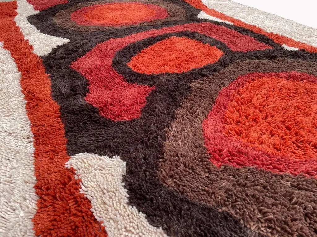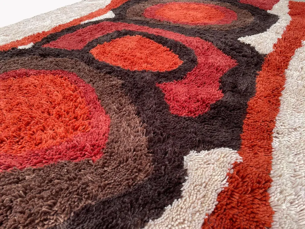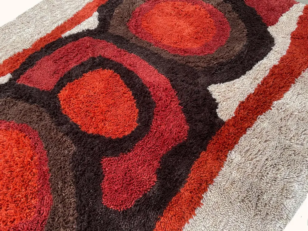 We are proud to offer these brand new, finely crafted, high quality designer shag rugs. These are truly inspired by the classic Scandinavian rug designs of the 1950’s and 1960’s. The entire look and feel were made to bring you back in time, from the long generous pile, to the period correct color palettes. These designs will surely add that extra pizzaz to your Mid-Century Modern or contemporary home.Size- 5 x 7 (feet) actual 62” x 84” (inches)Material- AcrylicPile length- 1.35 InchesStyle- Mid-Century ModernCountry of origin- IndiaColor- Cream, orange, red, Dk brown, Lt. Brown.