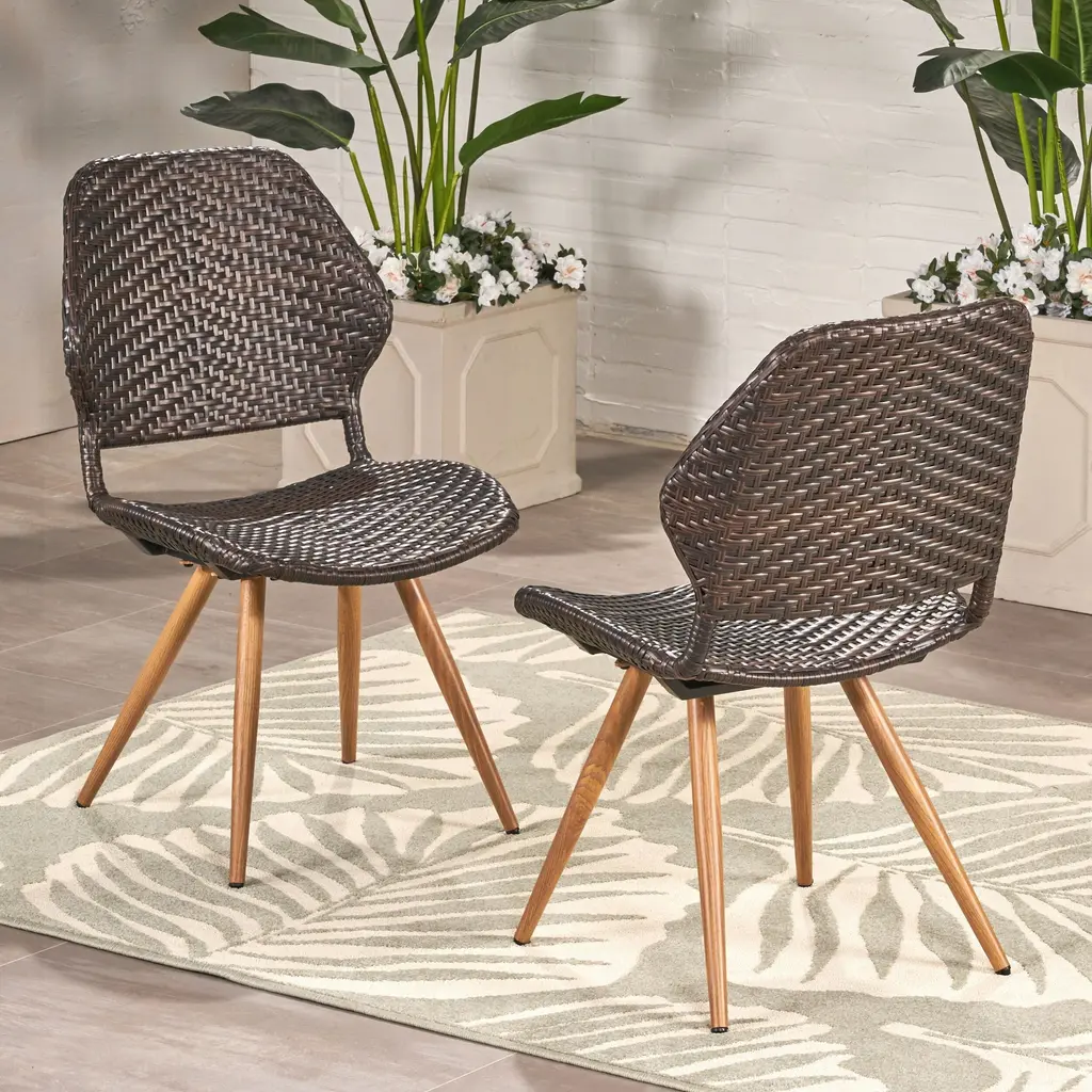 Mid-Century Wicker Dining Chairs - Durable Style for Outdoor Living Key Features **1. Timeless Design with Modern Durability Powder-coated iron frame with realistic wood-grain finish (rust-resistant) Mid-century inspired tapered legs for retro-modern flair Tightly woven PE wicker in multi-brown tones (UV-resistant for 500+ hours) **2. Engineered for Comfort Feature Benefit Integrated cushion 3" thick, high-resiliency foam (non-removable) Ergonomically curved seat 18" seat depth for optimal thigh support Weight capacity 300 lbs per chair (reinforced leg joints) **3. All-Weather Performance Weatherproof construction withstands: ✓ Rain (water beads on wicker surface) ✓ Humidity (moisture-wicking frame coating) ✓ Temperature swings (-15°C to 60°C stable) Technical Specifications Dimensions: 22"W × 24"D × 33"H (standard dining height) Weight: 13.2 lbs/chair (easy to reposition) Set Includes: 2 chairs (fully assembled) Style Integration Color Palette: Warm brown gradients blend with: ✓ Teak furniture ✓ Terra cotta planters ✓ Neutral outdoor rugs Avoid Pairing: Overly ornate Victorian-style decorCare Instructions Monthly: Brush wicker with soft-bristle attachment Spot Cleaning: Mild soap + microfiber cloth for cushions Winter: Apply silicone spray to metal joints before storage Designer Notes "The graduated brown tones in the wicker mimic natural weathering - creating instant 'lived-in' charm without actual aging."