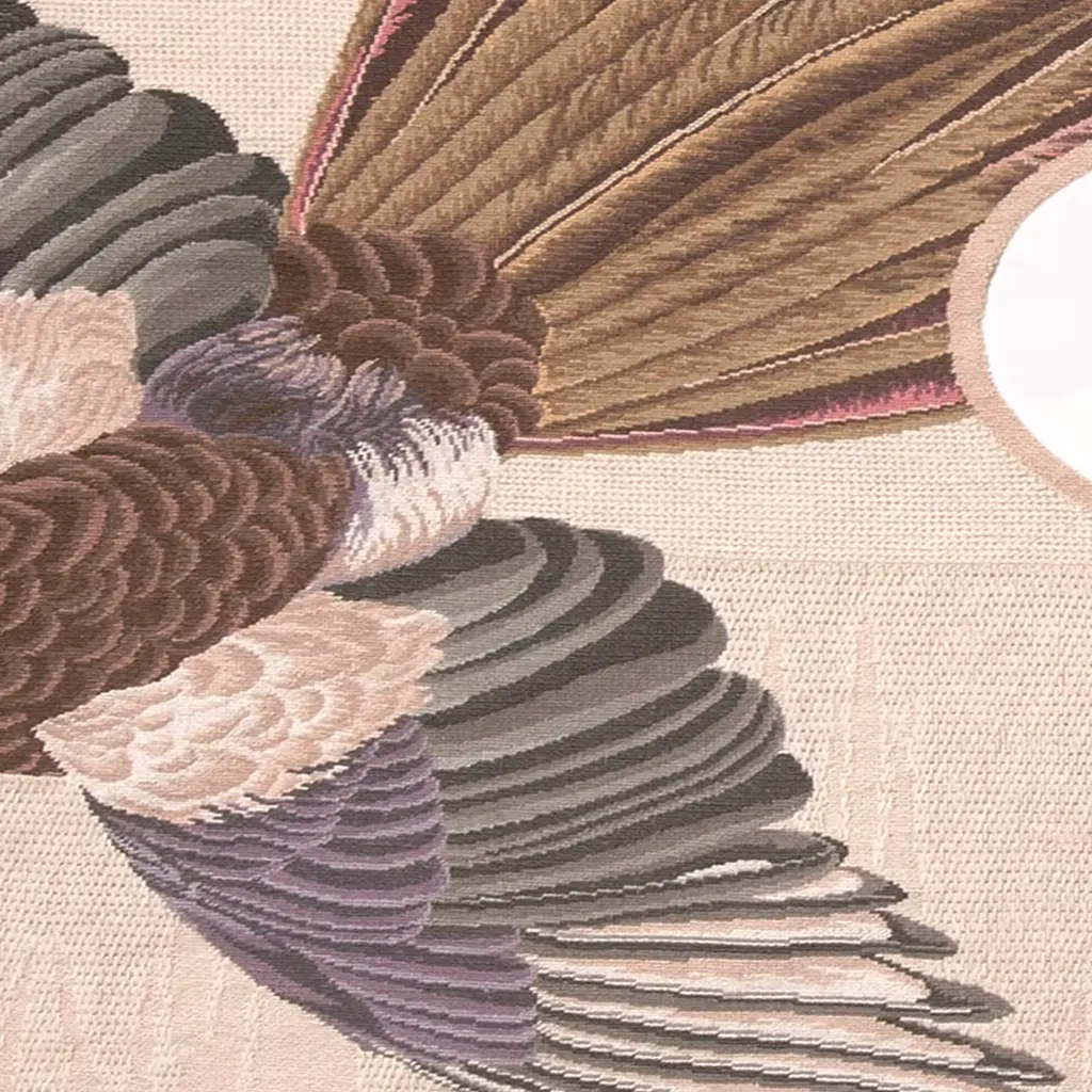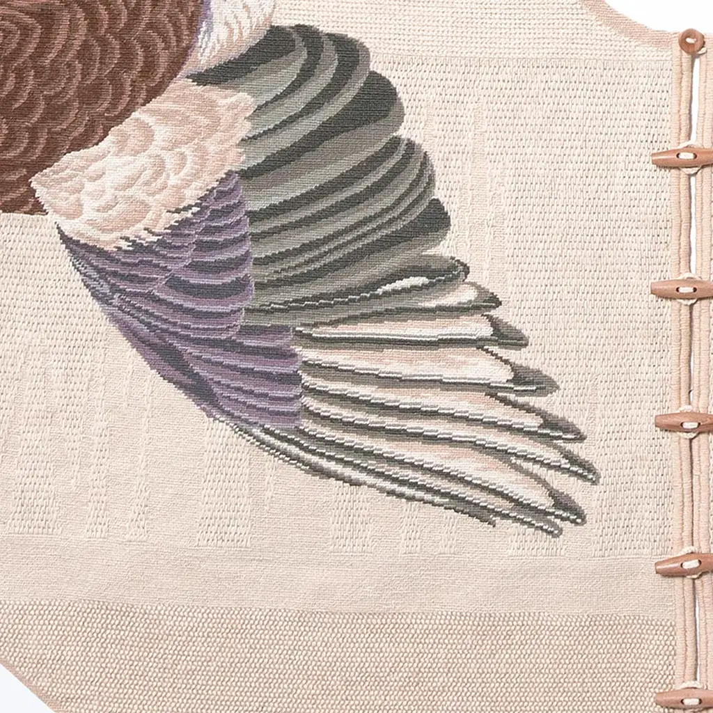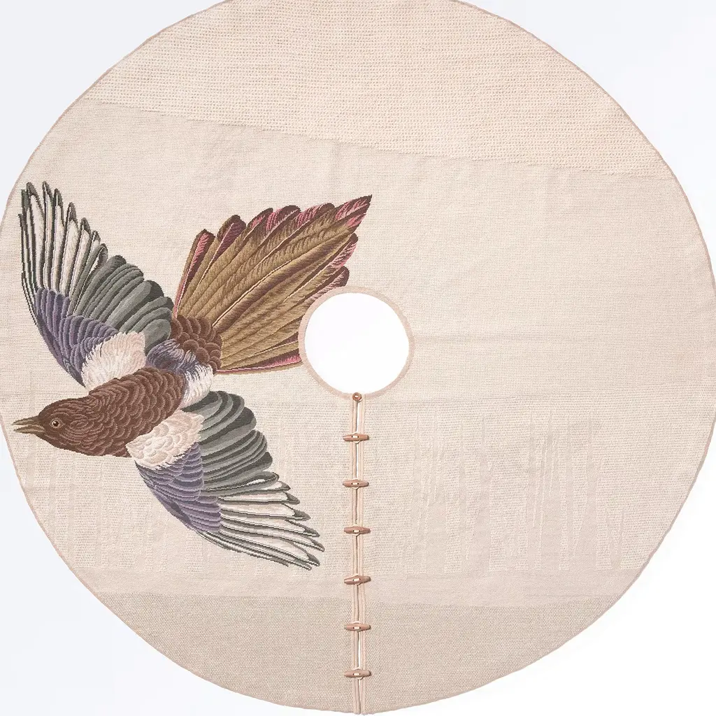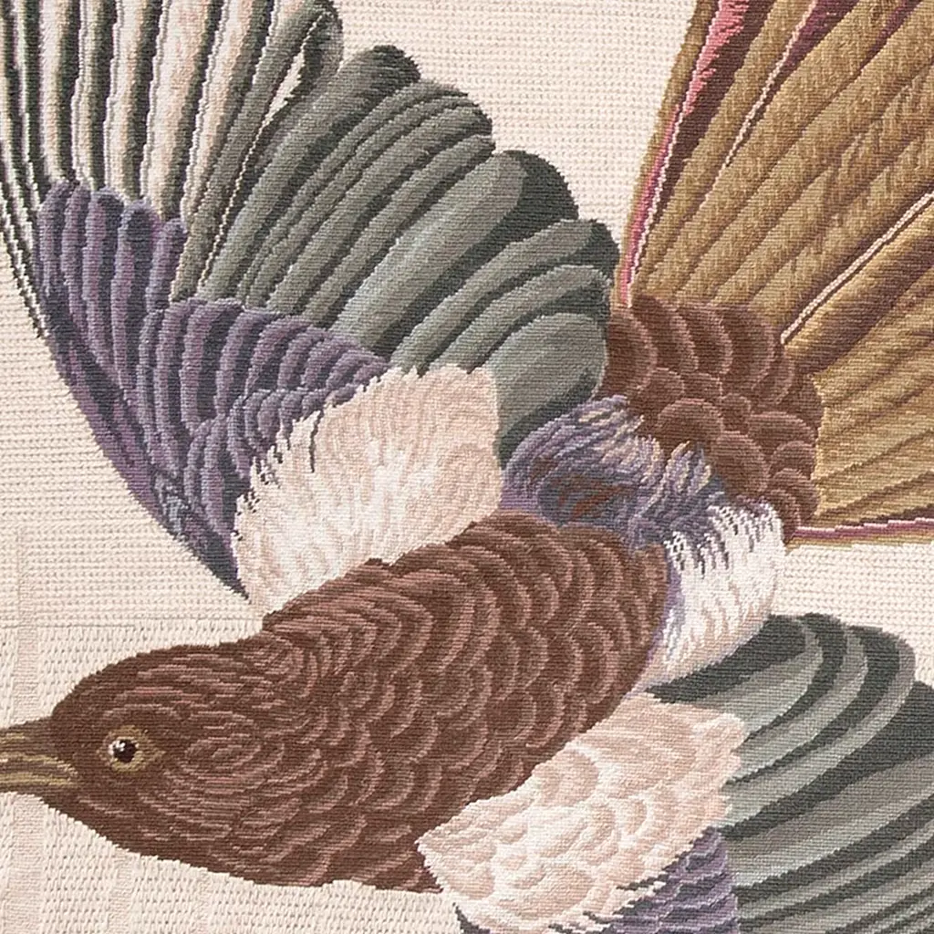 Hand-knotted in Portugal with wool using a needlepoint technique, this rug features a Eurasian magpie bird in flight rendered in captivating detail, the distinctive blue-green of the wongs and deep brown in the body and tail creating a dynamic composition that stands out against the beige background. Designed by FormaFantasma in 2011, this exclusive rug is part of a limited edition of only five pieces.
