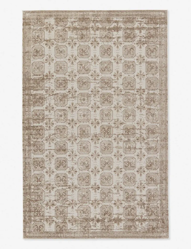 The incredibly chic Nadine collection offers durability and easy-care without compromising one bit on the style. This kid and pet-friendly assortment of rugs features a washable quality and a range of globally inspired designs that anchor rooms with eye-catching appeal. The Milea rug showcases a slightly distressed trellis pattern in tan on a cream and beige striated background. The 100% polyester fibers provide a slight sheen and lasting quality that thrives in high traffic areas of the home such as kitchens, bathrooms, living rooms, bedrooms, and halls.