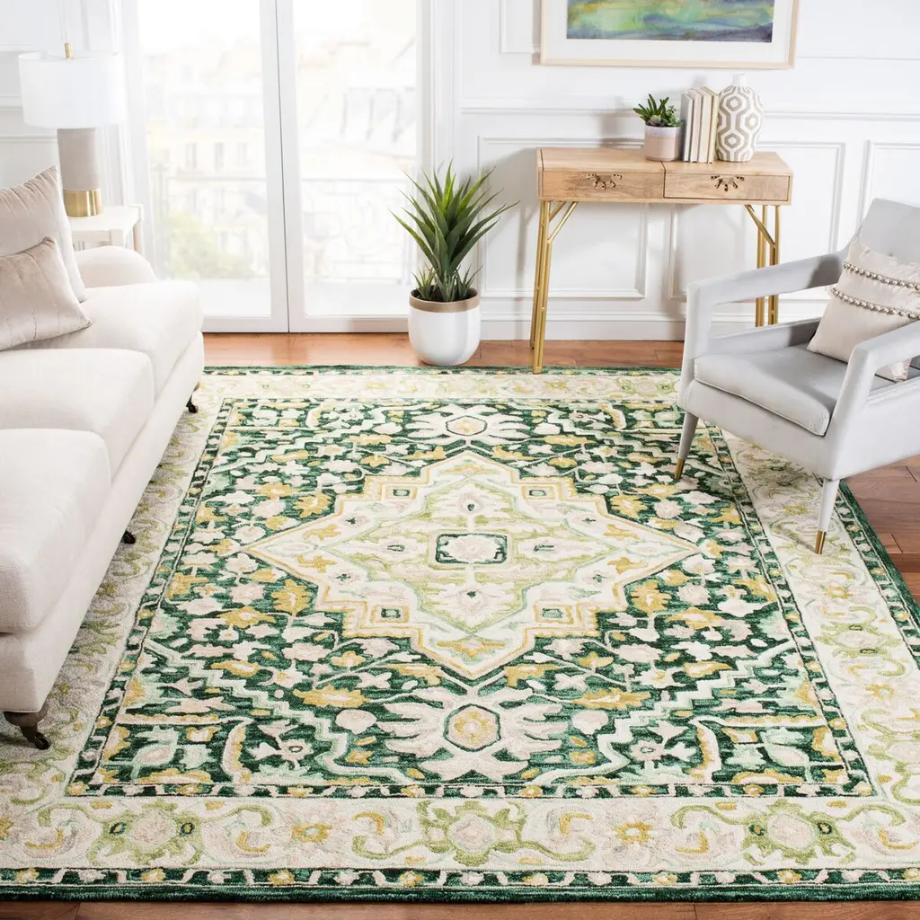Elevate your living space with the vibrant charm of our Bohemian-style hand-tufted wool area rug, size 4' x 6', and a cozy height of 1/4". Crafted with passion in India, this small rectangle rug embodies a symphony of rich greens and warm reds that come alive in an intricate, heritage-inspired pattern. Every detail of the design resonates with the spirit of Bohemian flair ? from the anchored central medallion to the stylized florals and geometric contours that dance across its surface. The lush, dense pile promises both comfort and durability, making it a practical yet stylish choice for any room seeking a touch of artistic character. Surround yourself with the timeless beauty of this woolen masterpiece, where traditional craftsmanship meets contemporary comfort. Perfect for adding a touch of elegance to your home, this rug's pattern imbued with historical significance and modern appeal will be the focal point of admiration and conversation.