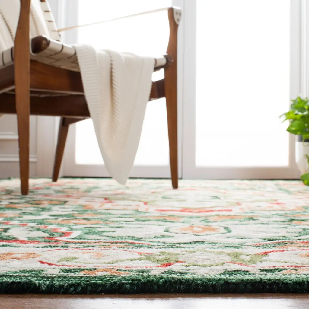 Elevate your living space with the vibrant charm of our Bohemian-style hand-tufted wool area rug, size 4' x 6', and a cozy height of 1/4". Crafted with passion in India, this small rectangle rug embodies a symphony of rich greens and warm reds that come alive in an intricate, heritage-inspired pattern. Every detail of the design resonates with the spirit of Bohemian flair ? from the anchored central medallion to the stylized florals and geometric contours that dance across its surface. The lush, dense pile promises both comfort and durability, making it a practical yet stylish choice for any room seeking a touch of artistic character. Surround yourself with the timeless beauty of this woolen masterpiece, where traditional craftsmanship meets contemporary comfort. Perfect for adding a touch of elegance to your home, this rug's pattern imbued with historical significance and modern appeal will be the focal point of admiration and conversation.