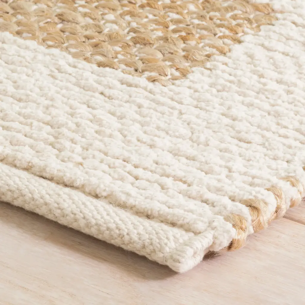 Sand bars of natural jute appear to float on a marled slubby cotton ground. Cool and crisp underfoot, jute and chenille cotton blend together in perfect synergy for hardworking comfort and style.