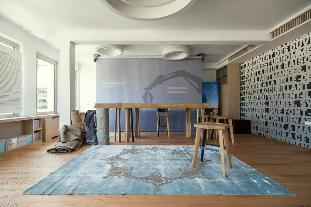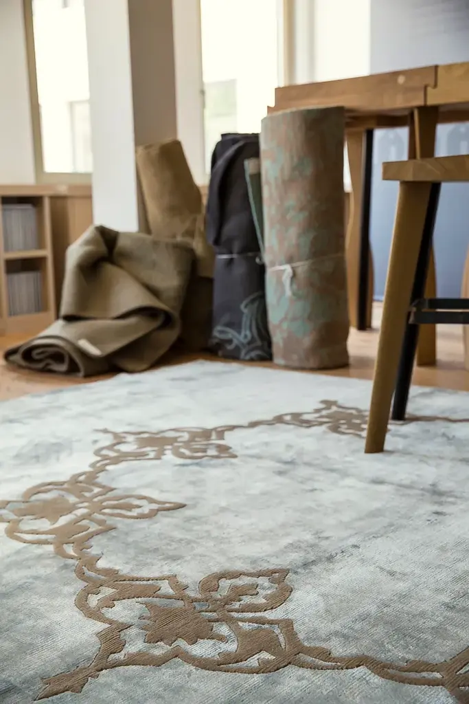 Contemporary hand knotted rug in viscose and natural wool.The name DaFé is taken from a tool used in carpet weaving which is tapped on the carpet to reinforce its knots. The DaFé collection started in 2014 from a study on old weaving methods and patterns. The experience of many generations in the field of carpets weaving and their knowledge of patterns and methods belonging to the various regions where this profitable craft started contributed to the creation of this unique hand-crafted collection. DaFé Collection is the result of a different approach to rugs as complementary parts of the interior environment. Despite appearing as an independent item, it has a strong and substantial harmonizing function. It is a versatile element that contributes to fulfilling a wide range of purposes such as the space’s mood, style and texture. Our work aimes at creating outstanding designs and using techniques of different eras belonging to different cultures and regions, to offer customers a handmade collection with a contemporary taste.Provenance: IndiaManual fabric cutting