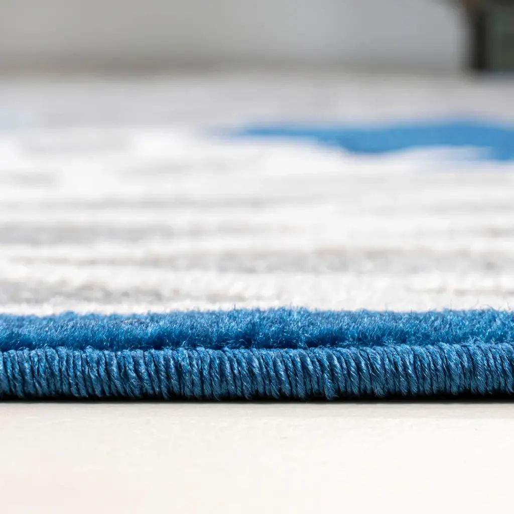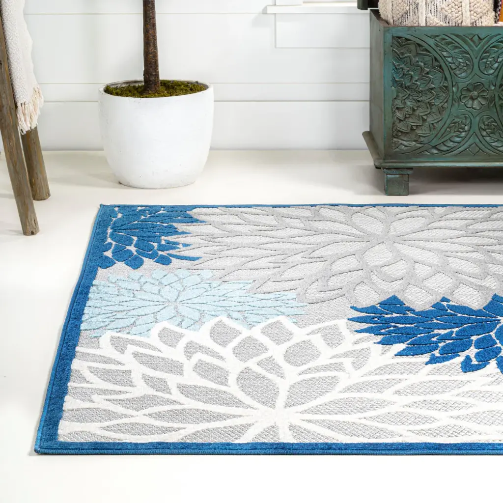 With its splashy, modern floral pattern in blue and aqua, this indoor-outdoor rug has a fresh look that''s ideal for a family room, dining room, bedroom, or kids'' rooms. Soft, durable synthetic fibers are an easy maintenance solution for homes with kids and pets. Choose from several colorways and add a splash of style to your porch or patio. Features:• Power loomed with a 0.2" pile that''s soft and durable• Woven with shades of blue, aqua and gray on an ivory ground• Made from easy-care polypropylene - just sweep, vacuum or hose down with mild soap and water• 100% 100% Polypropylene• No backing, use of rug pad is recommended (sold separately)• Power Loomed in Turkey• Actual Dimension: 4 ft. x 6 ft.• Color: Blue/Gray• Thickness measures: 0.2 in.• Available in multiple sizes and/or colorsRug Care:• Vacuum regularly and spot clean as needed; avoid direct and continuous exposure to sunlight; use brushless vacuum; remove spills immediately; if liquid, blot with clean, undyed cloth by pressing firmly around the spill to absorb as much as possible; for hard to remove stains, professional rug cleaning is recommended; store in a dry, well ventilated area and rotate for consistent wear• Packing and shipping may cause temporary creases in rugs, which will flatten out after a week on the floor; to expedite the process, try back-rolling your rug before laying it down, and then allow ample time for the remaining creases to relax• Please Note: Due to differences in monitors, some rug colors may vary slightly. Lengths and widths may vary from the published dimensions. Patterns may vary slightly according to shape and size selected.