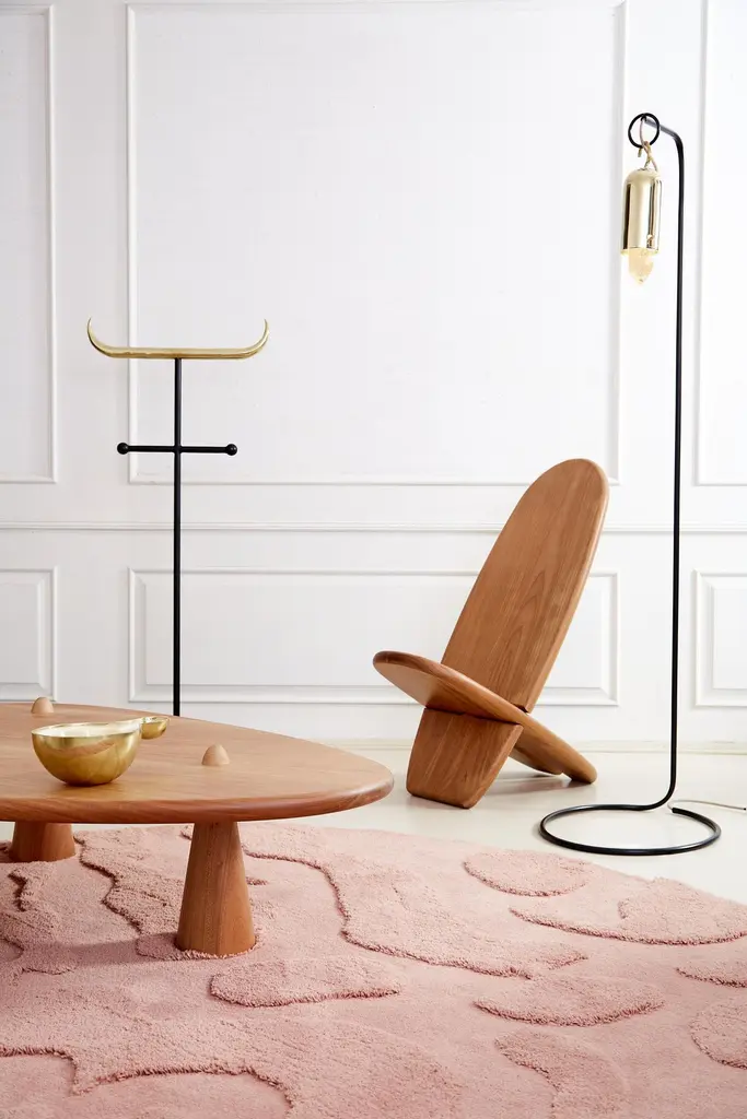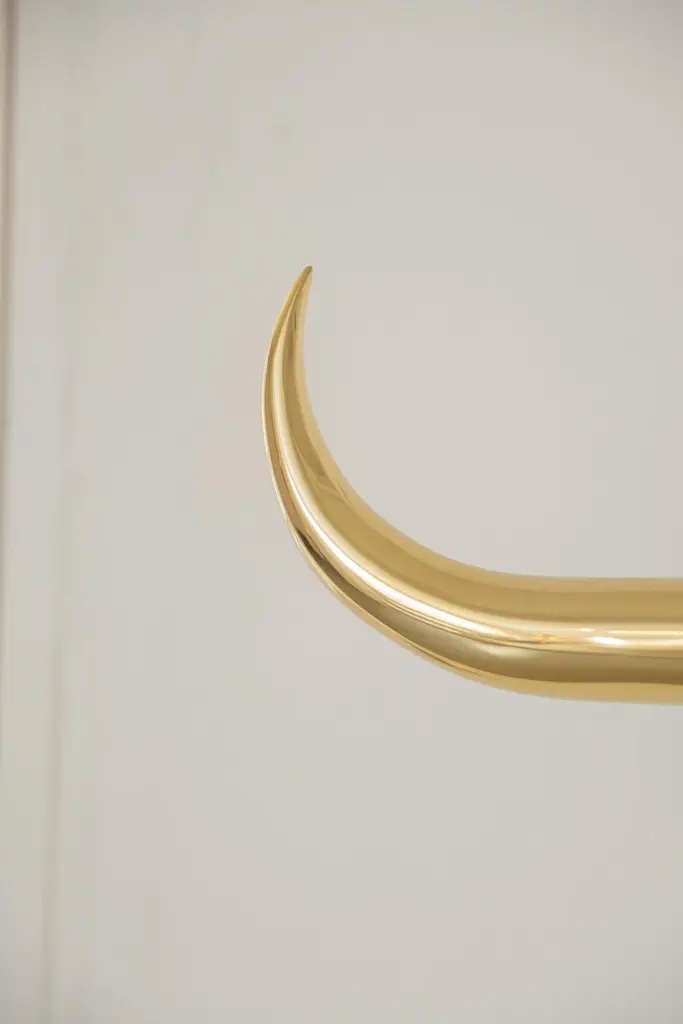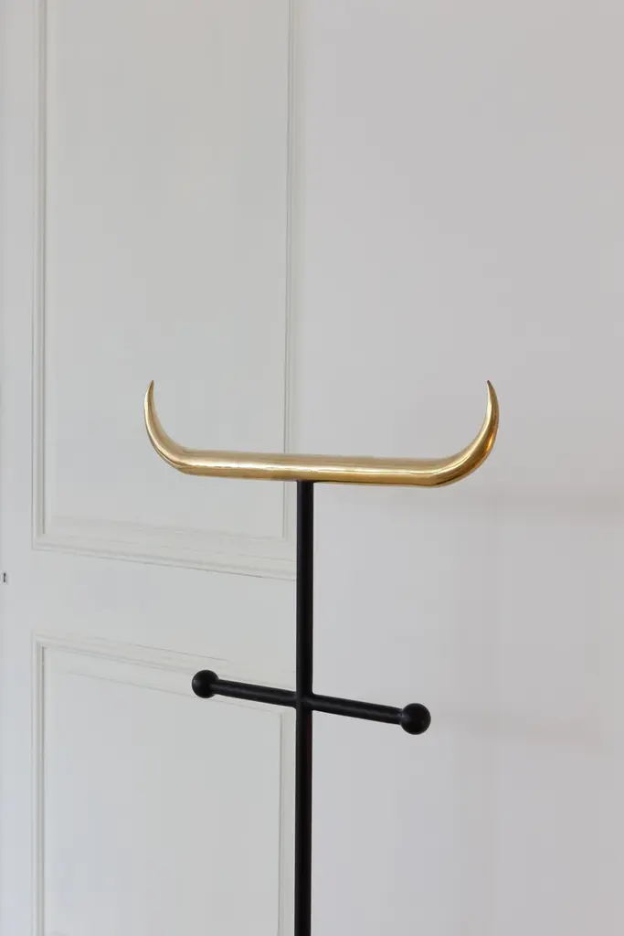 Minotauro Floor Hanger in Cast Brass & Nickel-Plated Steel by Studio OrthDimensions: D 61 x W 145 x H 145 cm. Materials: Cast brass and nickel-plated steel.Estúdio Orth is a multidisciplinary furniture and interior design office, founded in 2018 and based in São Paulo. With a palette of maximalist materials serving a minimalist aesthetic, its production presents a sculptural aspect over functional items such as lamps, seats, tables, rugs, and accessory objects for everyday use. Its work deals with themes such as symbolism and brutalism, exploring forms that move between the organic and rational.The Estúdio's signature aesthetic is defined by a distinct, cultivated repertoire, often driven by recurring fascinations. The horn, a favored symbol, frequently appears in their designs, shaping items like tables, mirrors, the Rino pendant and handle, and the Minotaur pendant and lamp.