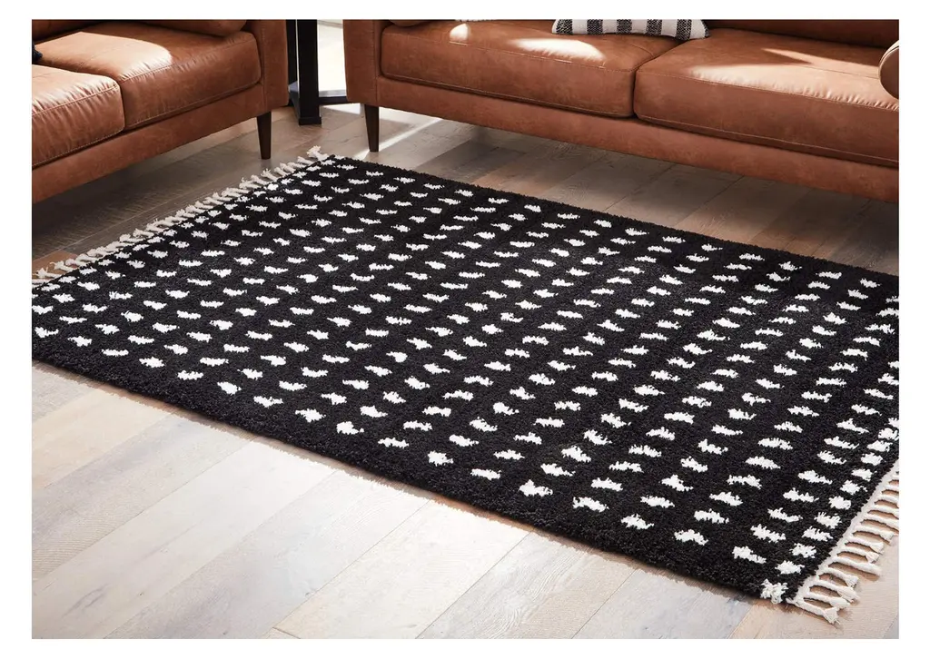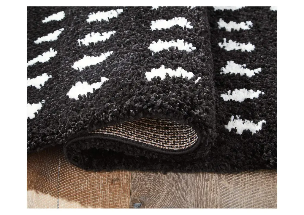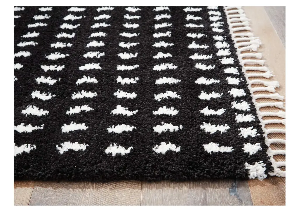 Sink your feet into the modern Minston area rug. Offering a luxurious shag with a woven dot design in black and white, it adds sophistication without sacrificing comfort or durability. A braided tassel edge completes the design of this family-friendly accent rug. Weight 36.000 lbs. (16.2kgs.)