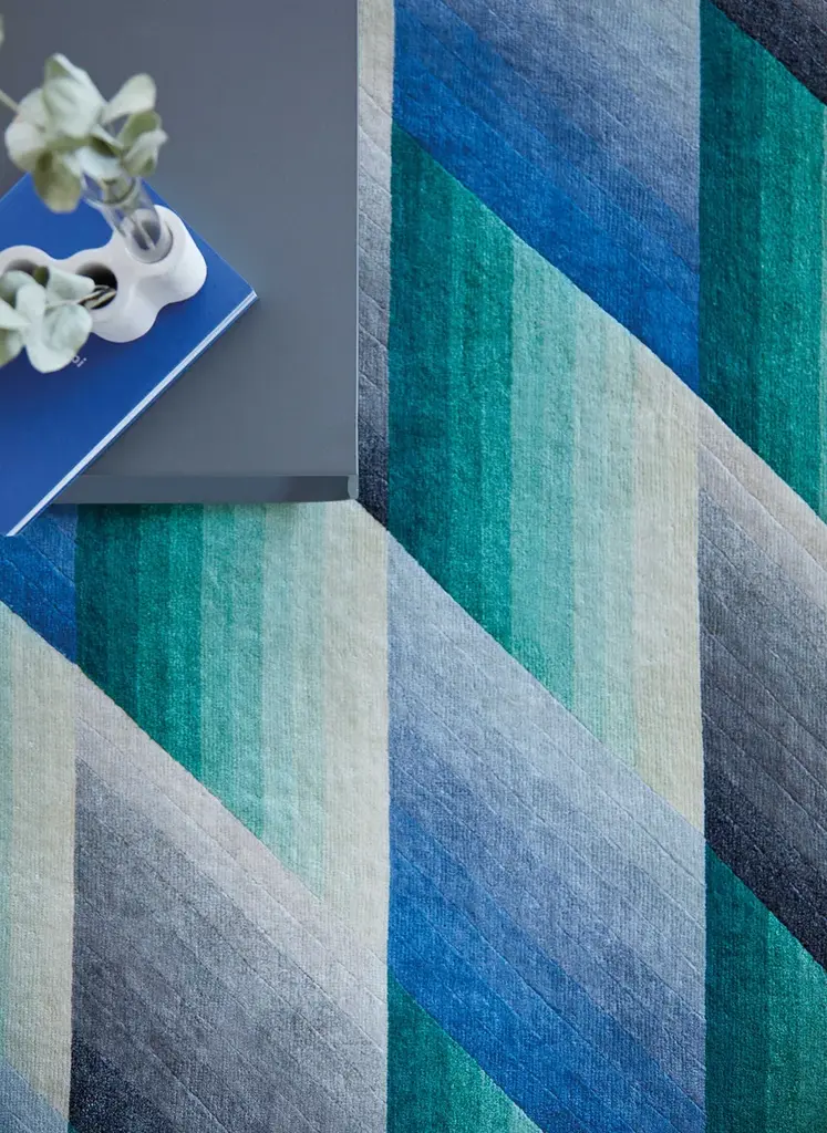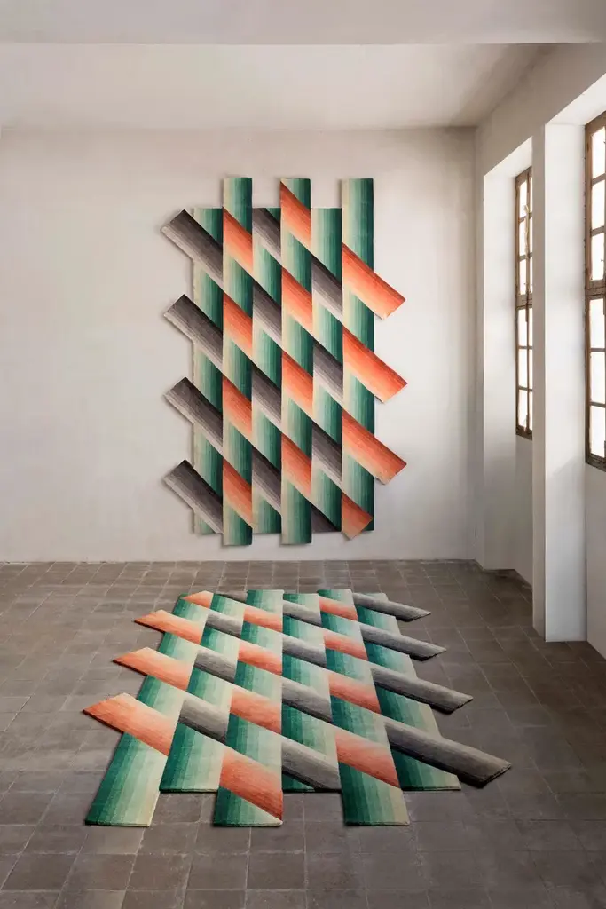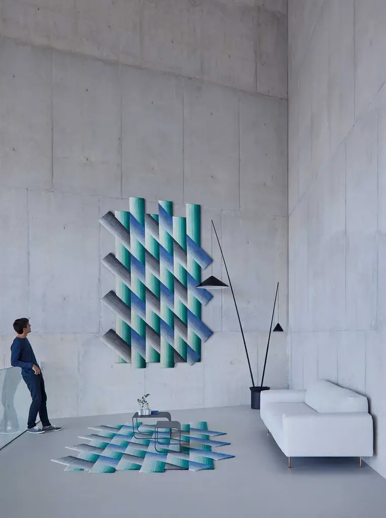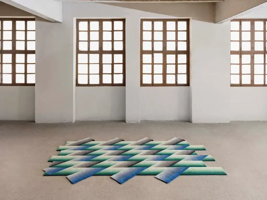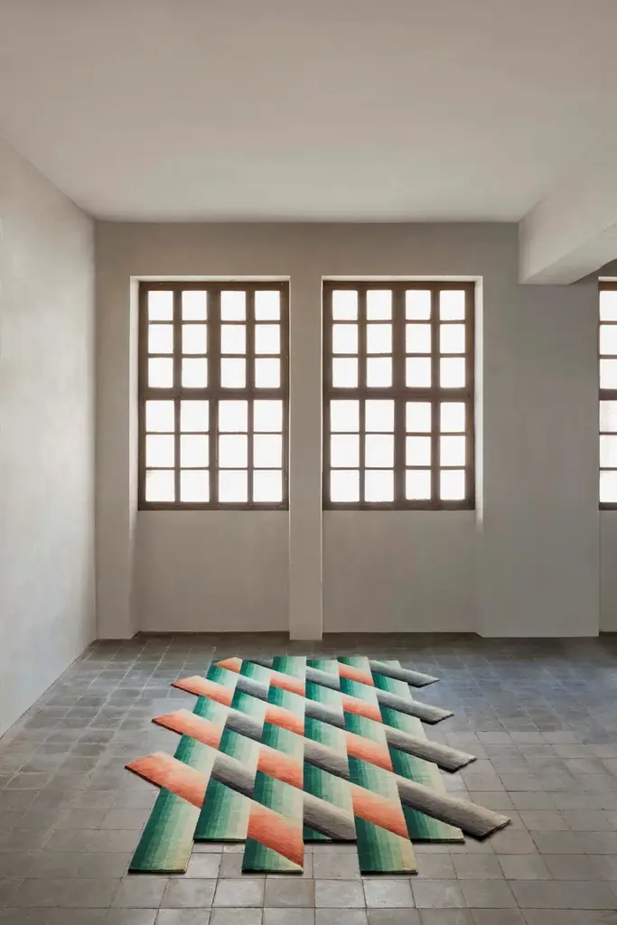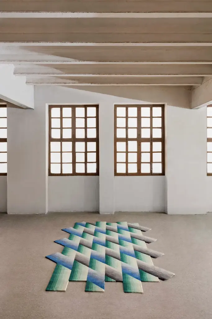 Patricia Urquiola creates another modern classic accessory. Mirage, the new collection of rugs designed for GAN, is destined to become a treasured icon. Colour, geometry and superimposition are combined with this rug of pure New Zealand wool manufactured using the hand-knotted technique.The mould-breaking approach and ongoing experimental nature of Patricia Urquiola’s work has produced a rug, Mirage, that takes on the qualities of a painterly work of art. Its formal power and tonal strength, the playful game of perspective and the illusion of movement of the interwoven bands, escaping the rectangular limits of a typical rug, recall Op art and avant-garde artistic movements of the beginnings of the 20th Century. The entire design of Mirage is inter-linked, with no beginning or end, just like Urquiola’s favoured expression.The colour shading in addition to defining the bands also creates a three dimensional effect that breaks out from the usual rectangular rug format. An exercise in three dimensional composition. The edges follow its logic as a series of angled rectangular bands that escape the regular form.Mirage is testament to the time and commitment that GAN provides its designers to come up with original creations employing craft sensibility and re-interpretations of tradition methods. Mirage is a technically complex rug to produce. The colour variations require an expert eye that organise the felt into precise bands of varying tones in the traditional hand knotted method.The collection is available in 200 x 310 cm format (6’7” x 9’11”); in three primary colour palettes; blue, orange and nude.Knot by knot, all of them made by hand. In other words: hand-knotted. The classic rug manufacturing technique to achieve perfection.