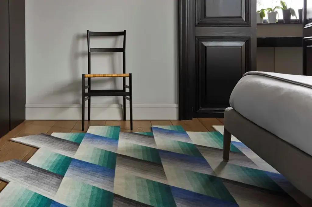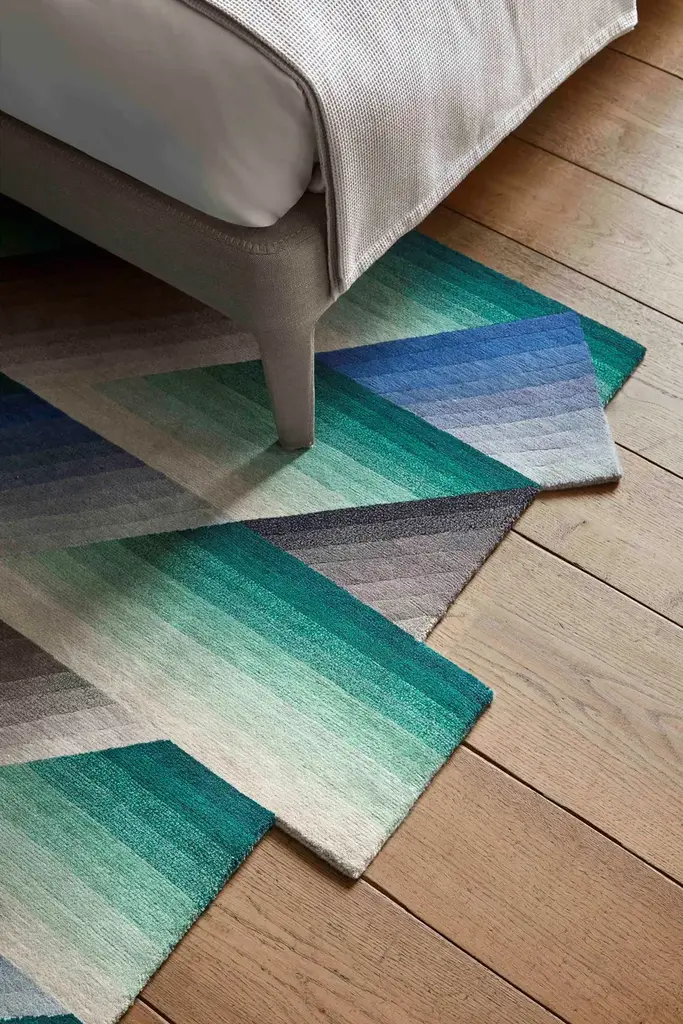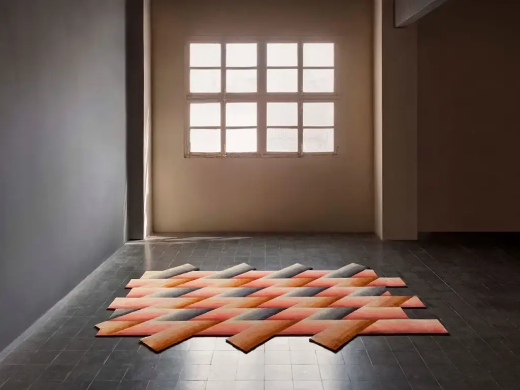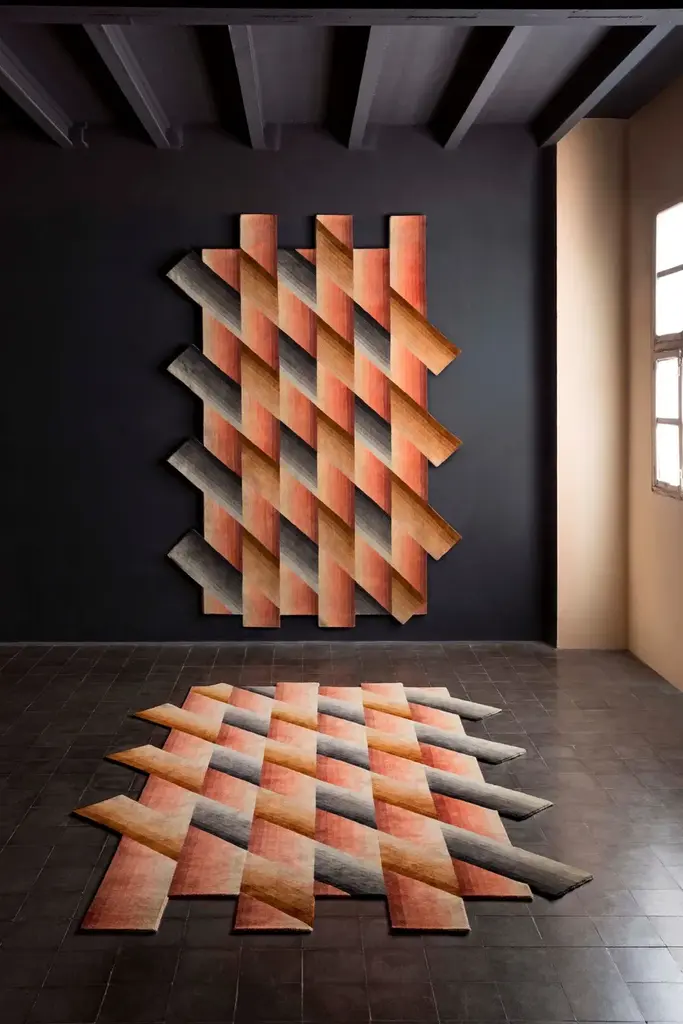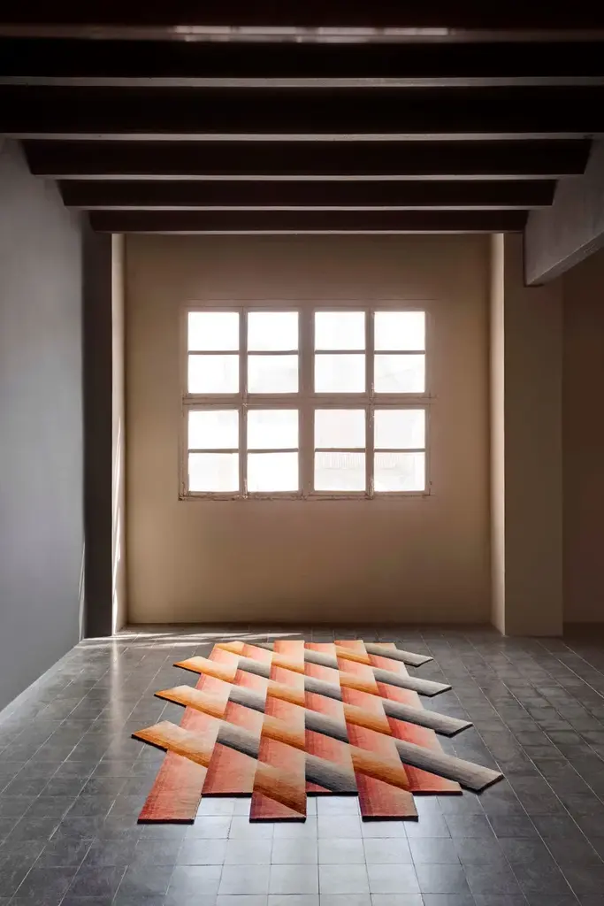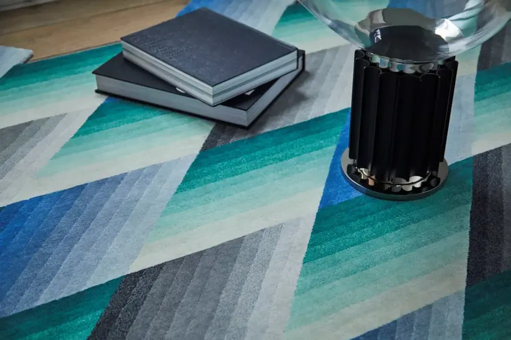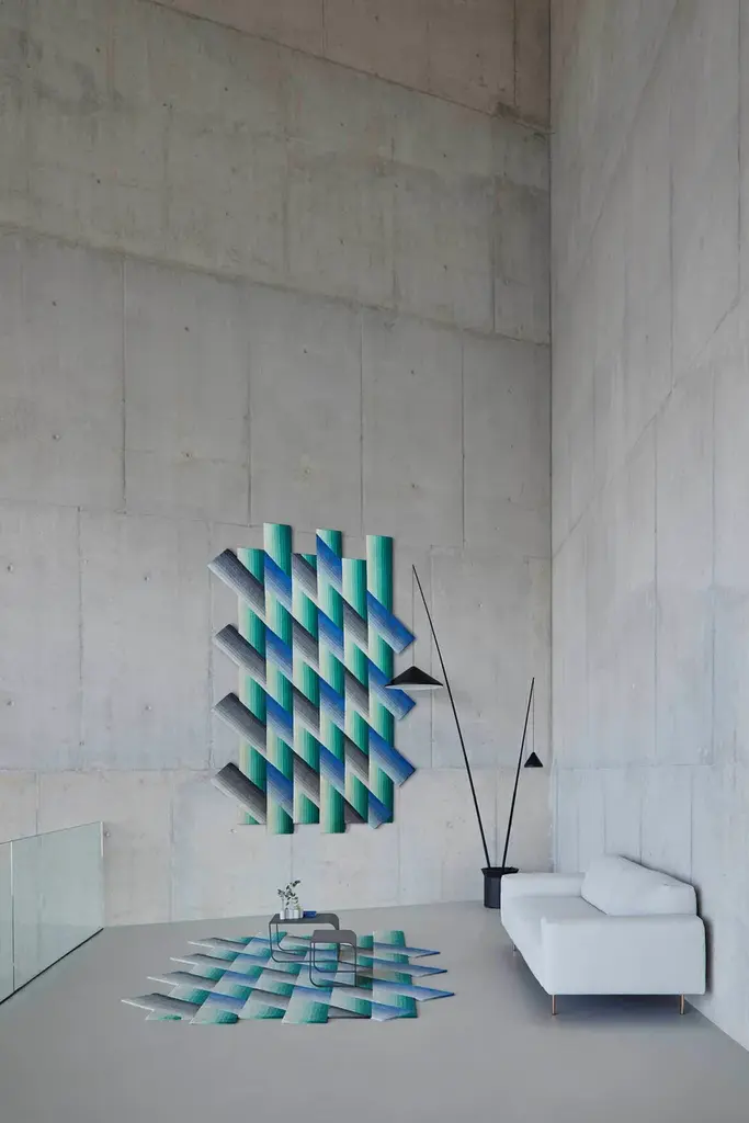 Patricia Urquiola creates another modern classic accessory. Mirage, the new collection of rugs designed for GAN, is destined to become a treasured icon. Colour, geometry and superimposition are combined with this rug of pure New Zealand wool manufactured using the hand-knotted technique.The mould-breaking approach and ongoing experimental nature of Patricia Urquiola’s work has produced a rug, Mirage, that takes on the qualities of a painterly work of art. Its formal power and tonal strength, the playful game of perspective and the illusion of movement of the interwoven bands, escaping the rectangular limits of a typical rug, recall Op art and avant-garde artistic movements of the beginnings of the 20th Century. The entire design of Mirage is inter-linked, with no beginning or end, just like Urquiola’s favoured expression.The colour shading in addition to defining the bands also creates a three dimensional effect that breaks out from the usual rectangular rug format. An exercise in three dimensional composition. The edges follow its logic as a series of angled rectangular bands that escape the regular form.Mirage is testament to the time and commitment that GAN provides its designers to come up with original creations employing craft sensibility and re-interpretations of tradition methods. Mirage is a technically complex rug to produce. The colour variations require an expert eye that organise the felt into precise bands of varying tones in the traditional hand knotted method.The collection is available in 200 x 310 cm format (6’7” x 9’11”); in three primary colour palettes; blue, orange and nude.Knot by knot, all of them made by hand. In other words: hand-knotted. The classic rug manufacturing technique to achieve perfection.