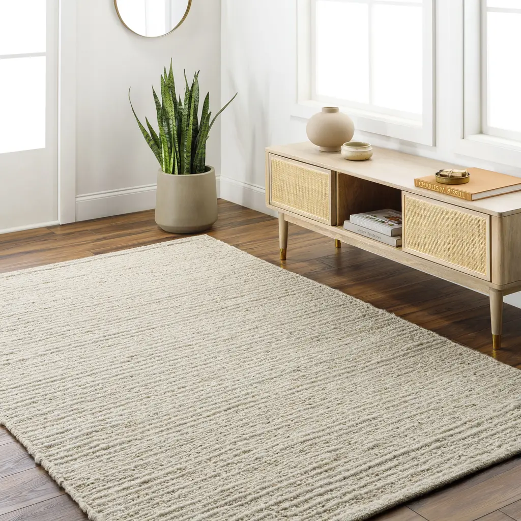 The simplistic yet compelling rugs from the Miramar Collection effortlessly serve as the exemplar representation of modern decor. The meticulously woven construction of these pieces boasts durability and will provide natural charm into your decor space. Made with Wool in India, and has No Pile. Spot Clean Only, One Year Limited Warranty.