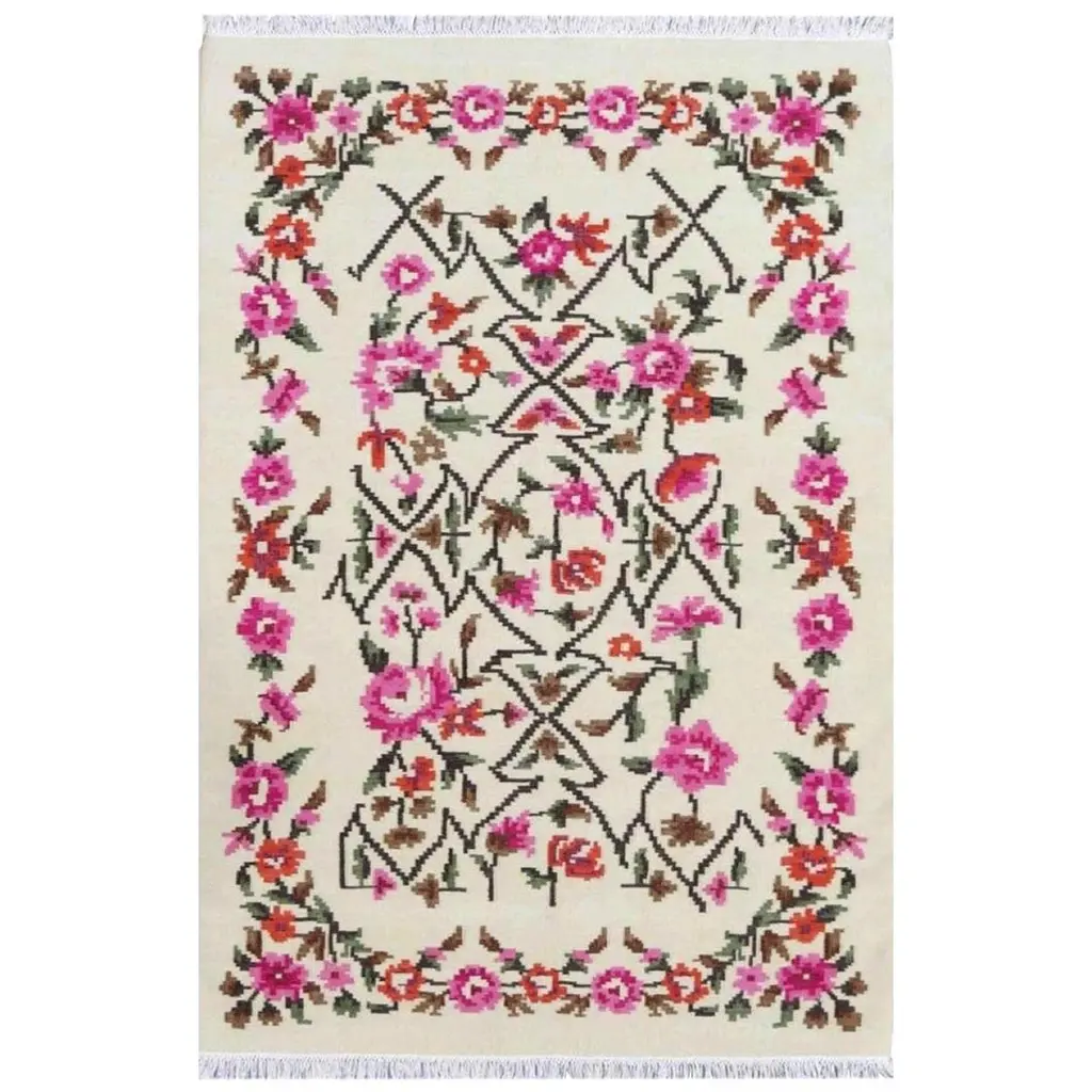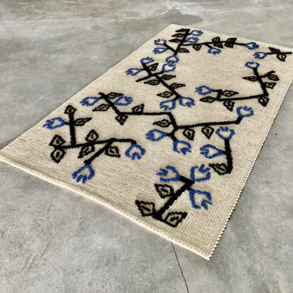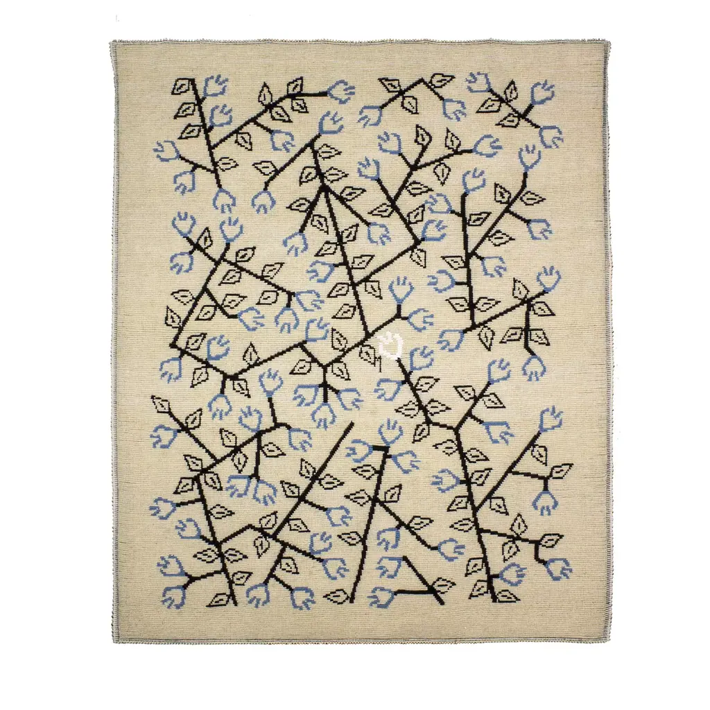 Part of the Symbolic Tessile Collection, this one-of-a-kind rug encapsulates Sardinian cultural and naturalistic heritage. The dynamic embroidery of myrtle - hand-woven using blue and black wool threads on an ecru-toned backdrop lends it a fascinating chromatic and tactile feel recalling redolent myrtle bushes dotting the Sardinian landscape.