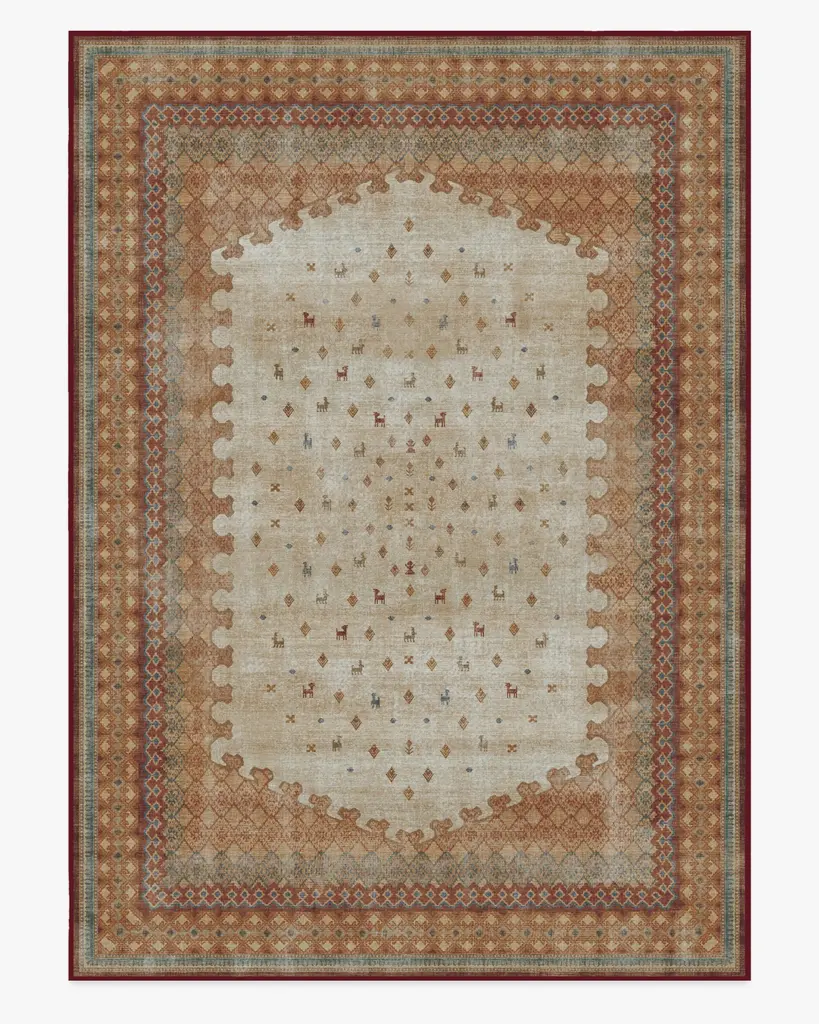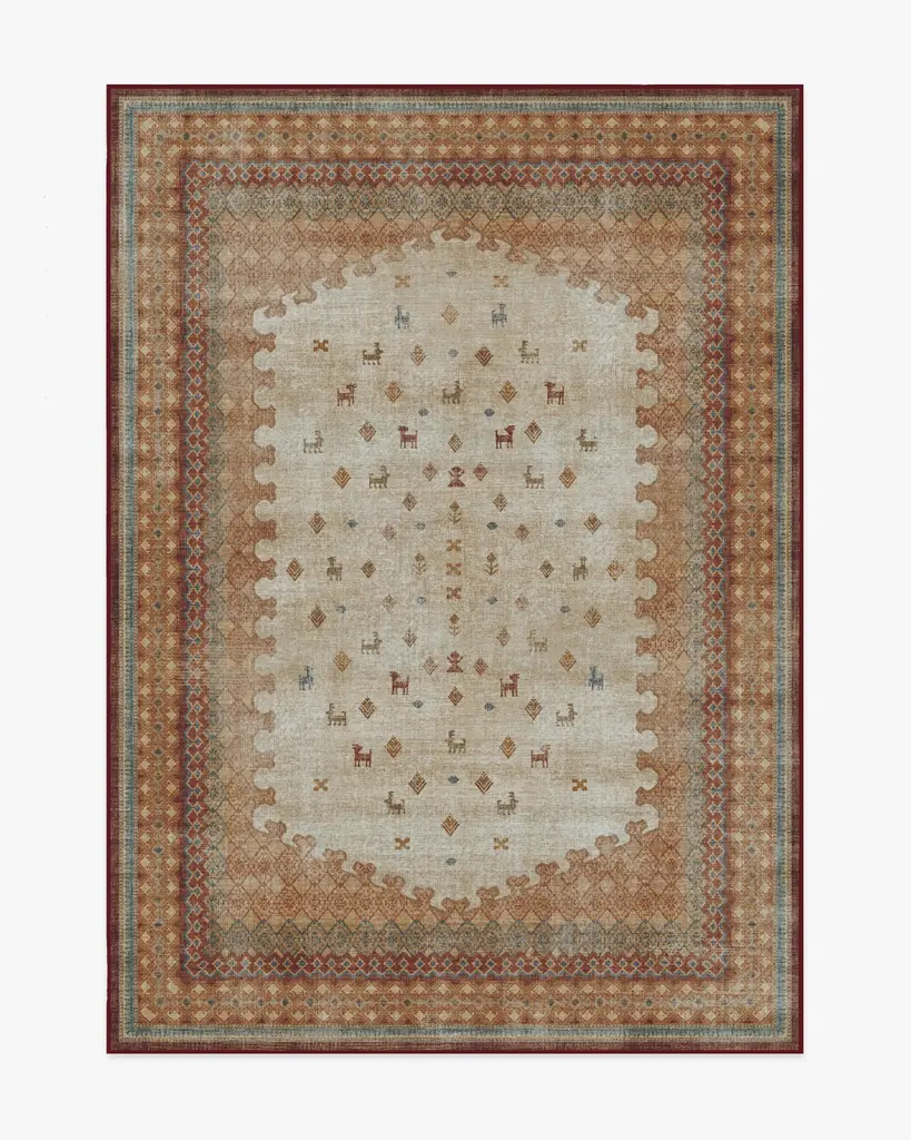 Add a rich, cultural aesthetic to any room with our Martyn Lawrence Bullard Mitra Multicolor Rug. This folk-inspired design is a classic addition to the Martyn Lawrence Bullard Collection, featuring ornate symbols, glyphs, and geometric elements that exude rustic charm. The warm cream, terracotta reds, golds, and touches of blue embellishments create a superbly folky element that is both playful and traditional. Water-resistant, stain-resistant, and machine-washable. Rug colors may vary slightly according to your device and the lighting in your space.