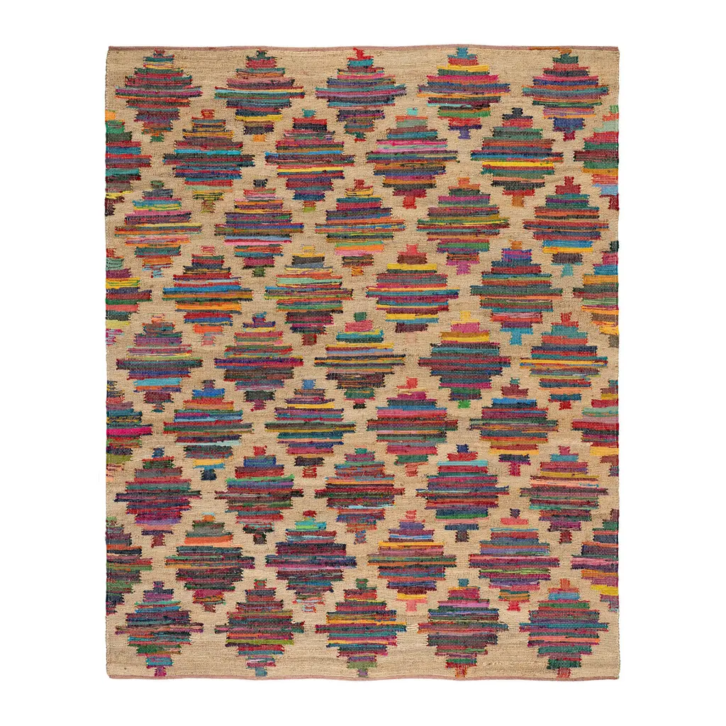 A rainbow of colorful cutting room scraps gets a second chance to shine as they weave their way through a natural jute ground. Each handwoven rug has a unique placement of kaleidoscopic colors in a bold geometric pattern, enhancing its beauty. Guaranteed to light up your floor, this sustainably produced rag rug ticks all the boxes.