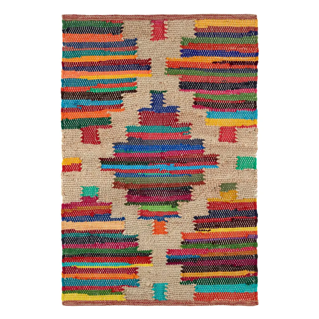 A rainbow of colorful cutting room scraps gets a second chance to shine as they weave their way through a natural jute ground. Each handwoven rug has a unique placement of kaleidoscopic colors in a bold geometric pattern, enhancing its beauty. Guaranteed to light up your floor, this sustainably produced rag rug ticks all the boxes.