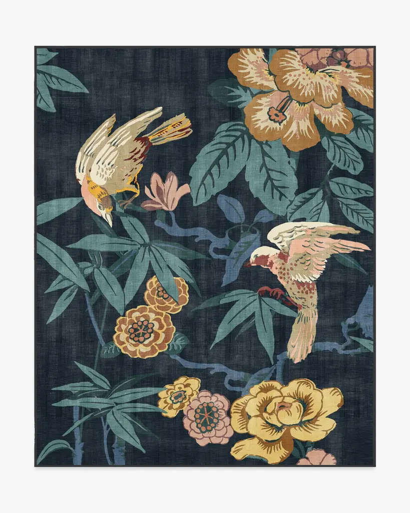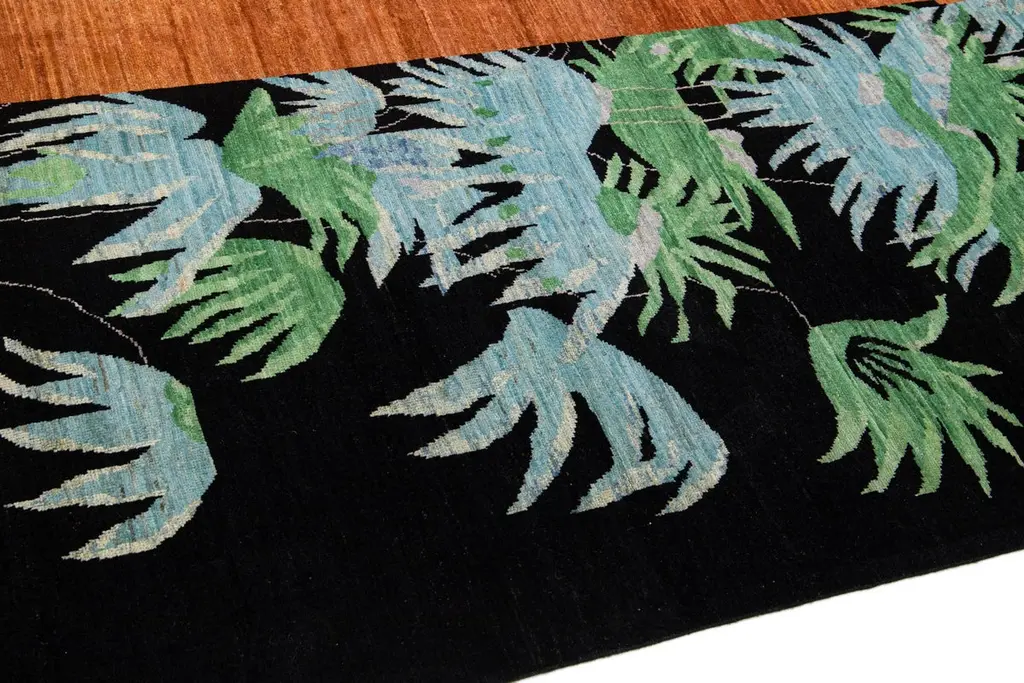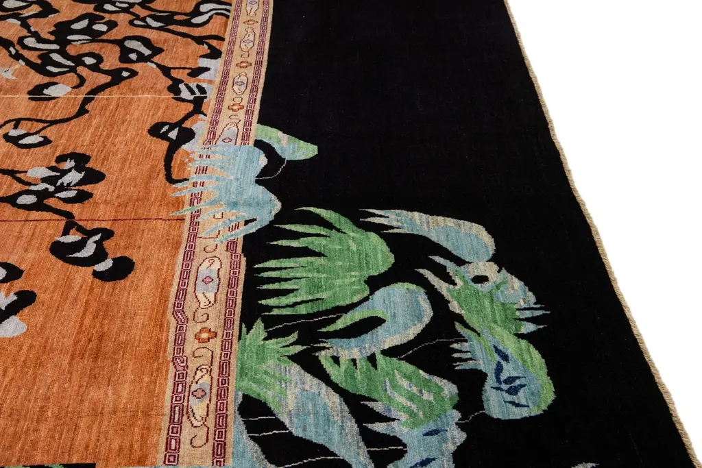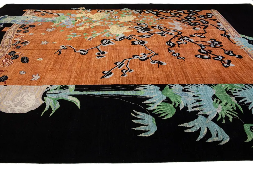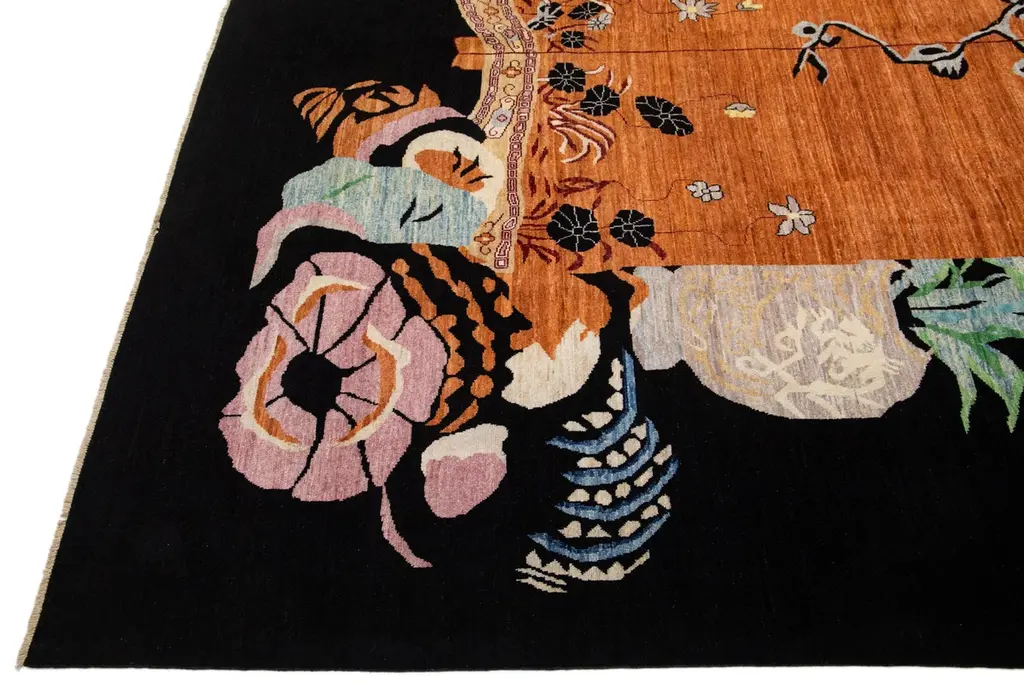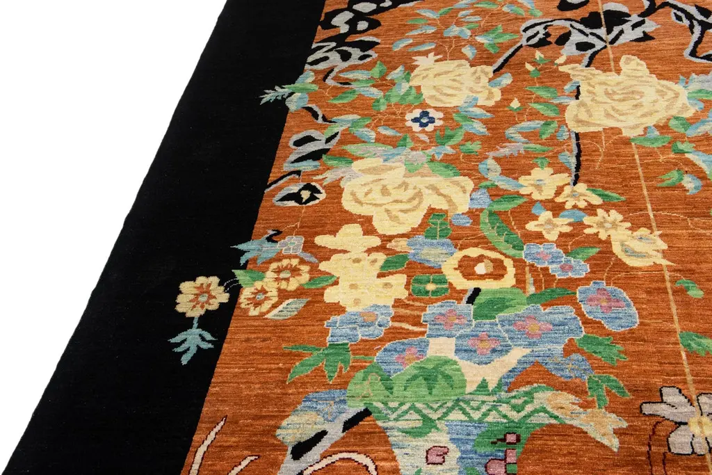 Beautiful Modern Art Deco hand-knotted wool rug with a brown field. This Chinese-style rug has a wide black frame and multicolor accent colors with a gorgeous all-over Chinese floral design. This rug measures: 13'6" x 18'7".