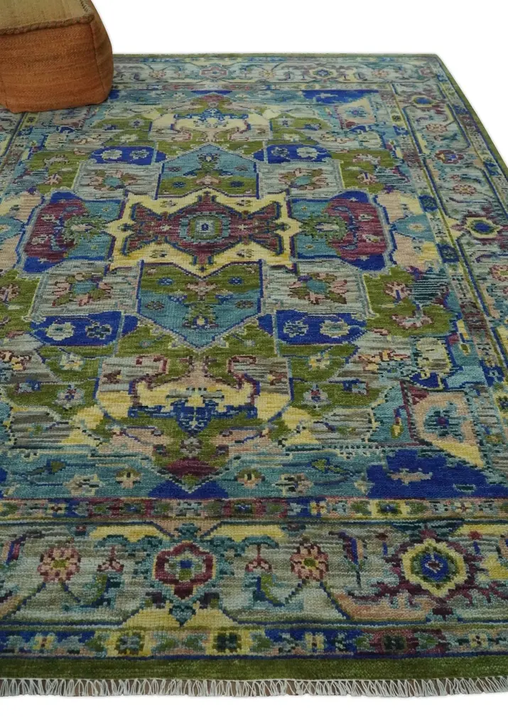 Modern Colorful Moss Green, Blue And Silver Traditional Turkish Design Heriz Wool Area Rug - 2.6x9