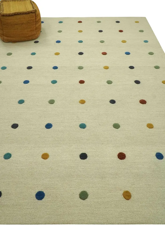 This Modern Colorful Polka Dot Beige Hand Tufted Custom Made wool area rug is an expertly crafted addition to any room. Made with high-quality wool and featuring a vibrant polka dot design, this rug provides both style and comfort. Its custom-made construction and hand-tufted technique make it the perfect choice for a modern, colorful living space. Hand-Tufted Color: Beige Made with Wool loop-cut Pile Made to Order in 20-45 Days Perfect Fit for a modern room, kids, living or bedroom USERS GUIDE Avoid prolonged moisture Vacuum regularly and/or shake to remove dust Do not pull any loose threads. Use scissors to simply cut the ends Blot spills immediately with a white cloth. Harsh chemicals may damage or fade the rug Use rug protectors under heavy furniture