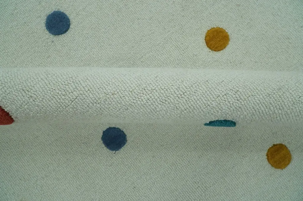 Expertly crafted with vibrant colors and fun polka dots, this custom-made wool area rug is the perfect addition to any modern space. Hand-tufted using high-quality ivory wool, it adds a playful touch while providing durable comfort. Bring a pop of personality to your room with this stylish and unique statement piece. Hand-Tufted Color: Ivory Made with Wool loop-cut Pile Made to Order in 20-45 Days Perfect Fit for a modern room, kids, living or bedroom USERS GUIDE Avoid prolonged moisture Vacuum regularly and/or shake to remove dust Do not pull any loose threads. Use scissors to simply cut the ends The blot spills immediately with a white cloth. Harsh chemicals may damage or fade the rug Use rug protectors under heavy furniture
