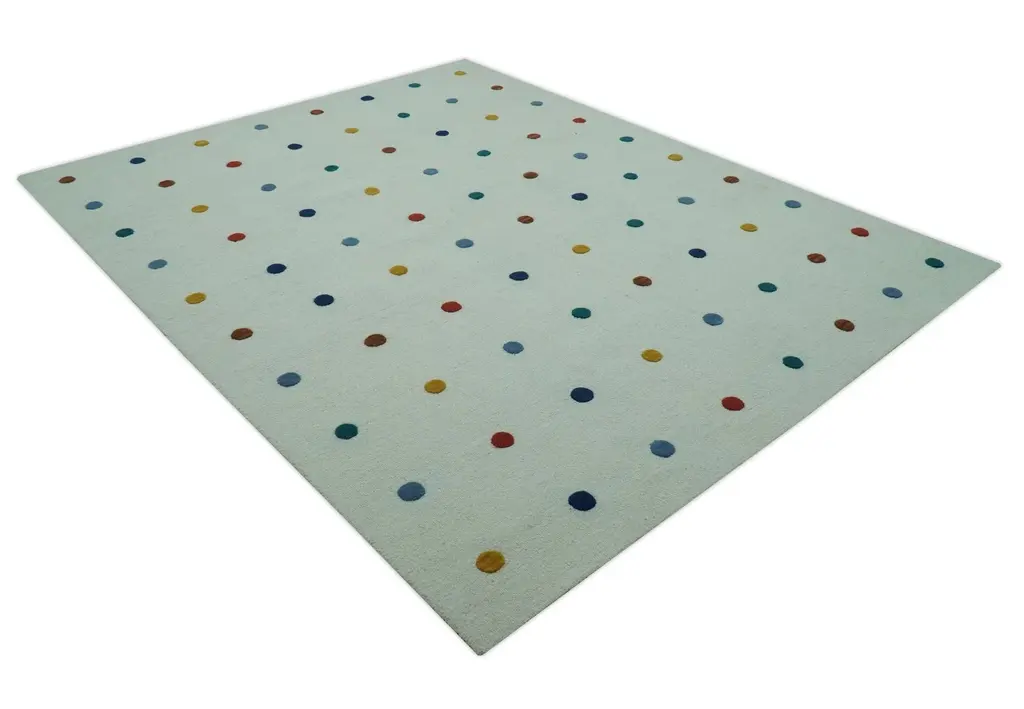 Expertly crafted with vibrant colors and fun polka dots, this custom-made wool area rug is the perfect addition to any modern space. Hand-tufted using high-quality ivory wool, it adds a playful touch while providing durable comfort. Bring a pop of personality to your room with this stylish and unique statement piece. Hand-Tufted Color: Ivory Made with Wool loop-cut Pile Made to Order in 20-45 Days Perfect Fit for a modern room, kids, living or bedroom USERS GUIDE Avoid prolonged moisture Vacuum regularly and/or shake to remove dust Do not pull any loose threads. Use scissors to simply cut the ends The blot spills immediately with a white cloth. Harsh chemicals may damage or fade the rug Use rug protectors under heavy furniture