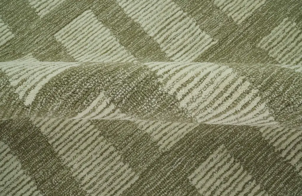 Expertly crafted using hand-tufted techniques, this modern geometrical rug features a unique olive and ivory design. Made with multi-size wool, the textured surface adds depth and warmth to any room. Perfect for adding a touch of sophistication to your home decor. Hand-tufted with Wool Loop Made to Order in 25-45 Days Color: Olive and Ivory Perfect Fit for a modern room, kids, living or bedroom USERS GUIDE Avoid prolonged moisture Vacuum regularly and/or shake to remove dust Do not pull any loose threads. Use scissors to simply cut the ends Blot spills immediately with a white cloth. Harsh chemicals may damage or fade the rug Use rug protectors under heavy furniture