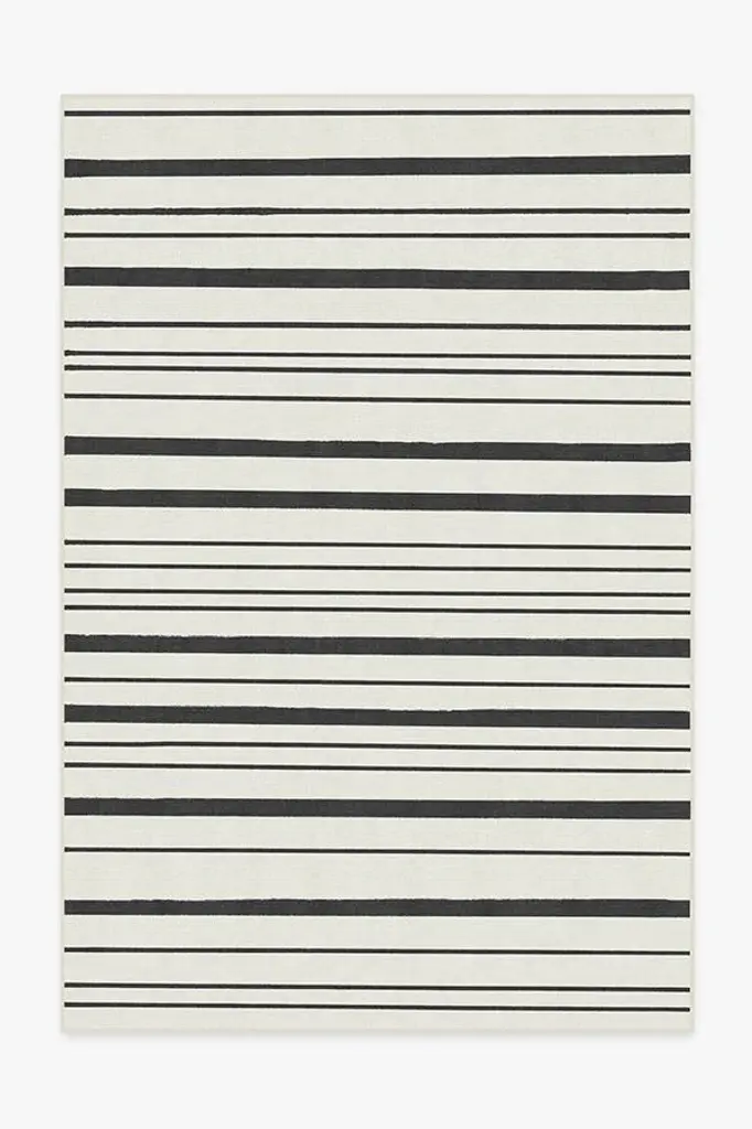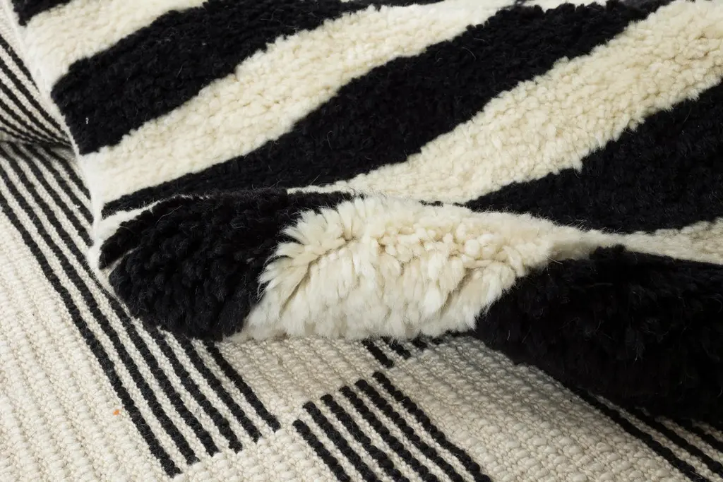 A bold and modern hand-knotted Tulu rug crafted from 100% hand-spun wool, featuring alternating black and ivory stripes that create a striking visual rhythm. With its clean geometric simplicity, this rug adapts beautifully to both contemporary and classic interiors, from minimalist lofts to elegant living rooms.Entirely woven by skilled women artisans in our Central Anatolian workshop, each piece continues a centuries-old weaving tradition while embracing modern design sensibilities. The thick, plush wool pile is soft underfoot, offering both comfort and durability—ideal for everyday family use as well as sophisticated designer projects.This rug can be custom-produced in any size, color combination, or pile thickness to meet your design vision. Standard production time is approximately 4–6 weeks, depending on size.Highlights:•100% hand-spun natural wool•Hand-knotted in Central Anatolia•Black and ivory striped modern design•Soft, cozy, and highly durable•Custom size, color, and design options availableStyling Notes:This striped rug is a versatile statement piece. In a modern interior, it brings bold contrast against neutral walls and clean-lined furniture. In a more traditional or eclectic home, the black-and-ivory palette acts as a grounding element, balancing colorful art or patterned textiles. Place it in a living room under a sofa set to elongate the space, or in a bedroom to add a cozy yet graphic accent underfoot.