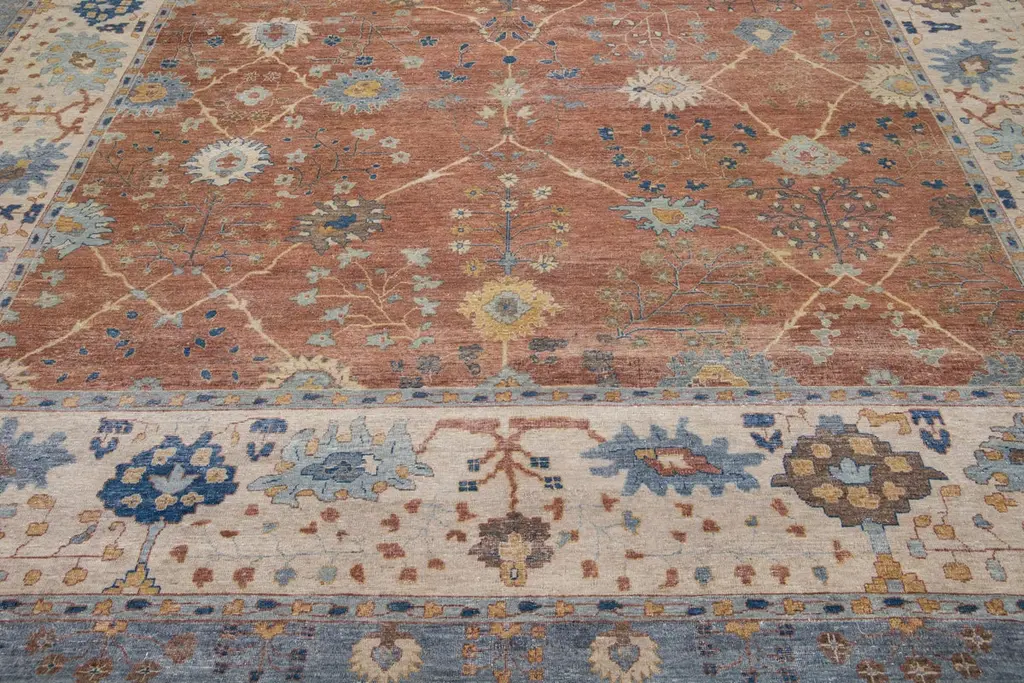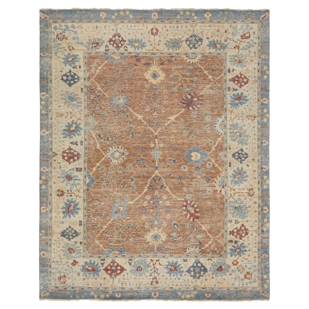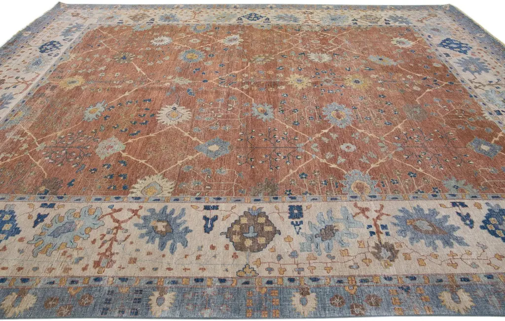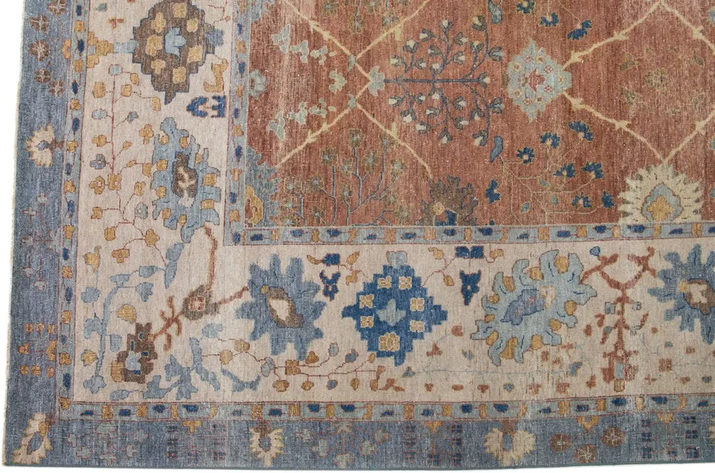 Apadana's Artisan line is an antique rug reimaging with an elegant way to inject a striking antique aesthetic into a space. This line of rugs is decidedly unique and reimagines what an antique rug look can be. Every single piece from our Artisan line is painstakingly woven by hand.This custom rug features a gorgeous all-over floral design with a brown color field with beige and blue accent colors. This rug measures: 12' x 14'11". Our rugs are professional cleaning before shipping.