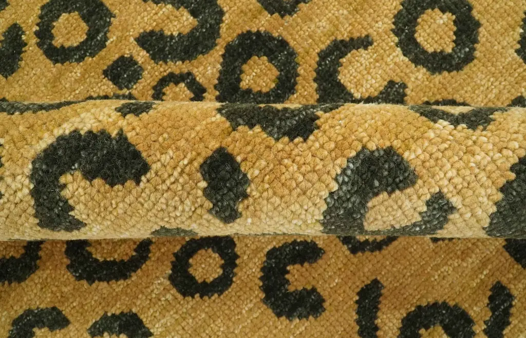 This hand-knotted wool rug features a modern leopard design with golden-brown and charcoal hues. Custom-made for a unique and stylish addition to any space. Its high-quality construction offers both durability and sophisticated appeal. Hand-Knotted Made with Wool Made to Order in 30-45 Days Color: Golden-Brown and Charcoal Made with 22 knots per Square inch USERS GUIDE Avoid prolonged moisture Vacuum regularly and/or shake to remove dust Do not pull any loose threads. Use scissors to simply cut the ends The blot spills immediately with a white cloth. Harsh chemicals may damage or fade the rug Use rug protectors under heavy furniture