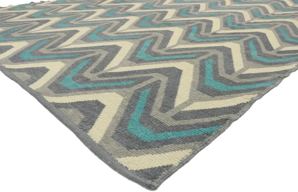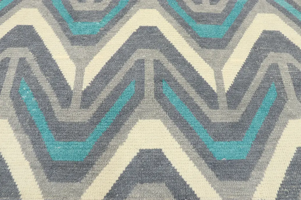 Emanating modern style with incredible detail and texture, this hand knotted wool Turkish Moroccan style rug is a captivating vision of woven beauty. The abstract chevron design and energetic colorway woven into this piece work together creating an instant focal point in nearly any space. An allover pattern composed of zigzag chevron lines covers the field. Bursting with color and creativity, this retro Moroccan area rug is lively yet, clean and modern.